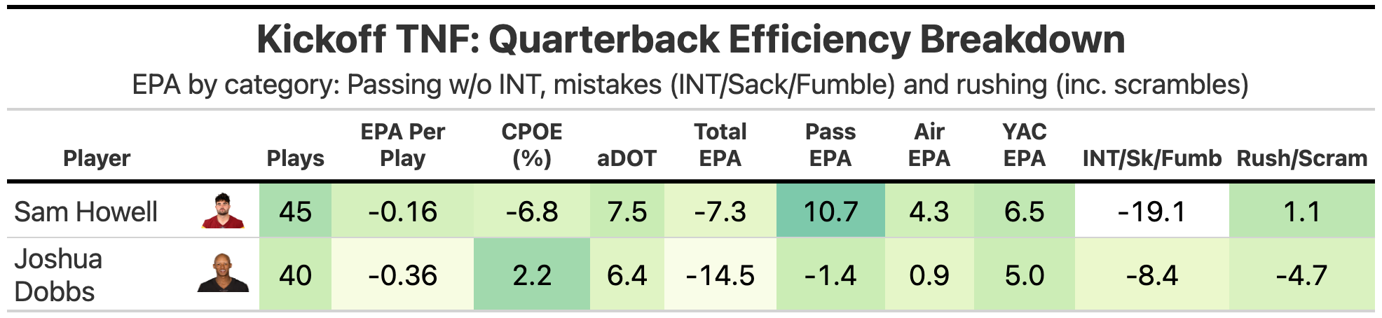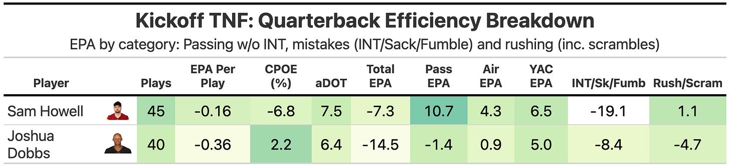 ** As the early season kinks get worked out at nflreadR, only the early game advanced stats are available right now. I’ll post the advanced reviews for the late-window and SNF on Monday morning (hopefully).