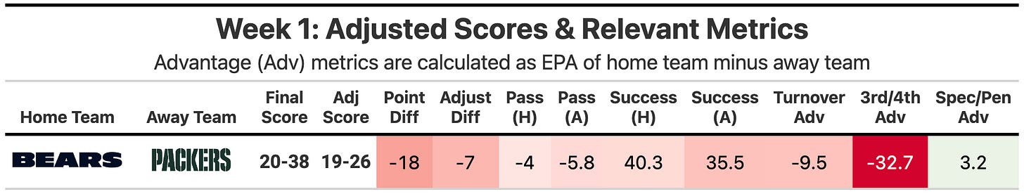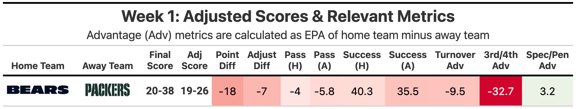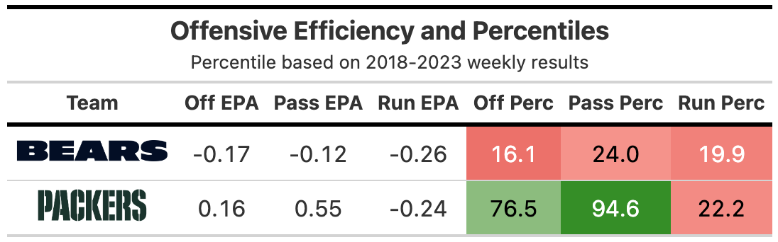 It won’t come as much consolation to Bears’ fans, but the fundamentals of their near-blowout loss to the Packers weren’t as dire as the final score. Late-down (3rd & 4th) results are the highest leverage, and highest variance plays in most games. The Packers absolutely destroyed the Bears on the handful of plays needed for conversions, to the tune of a 27-point advantage in EPA.