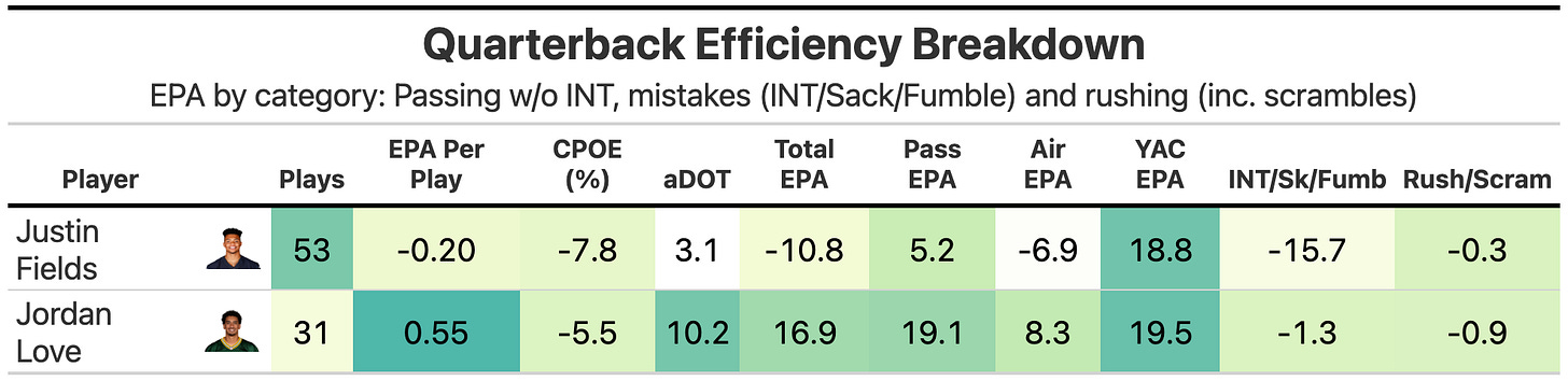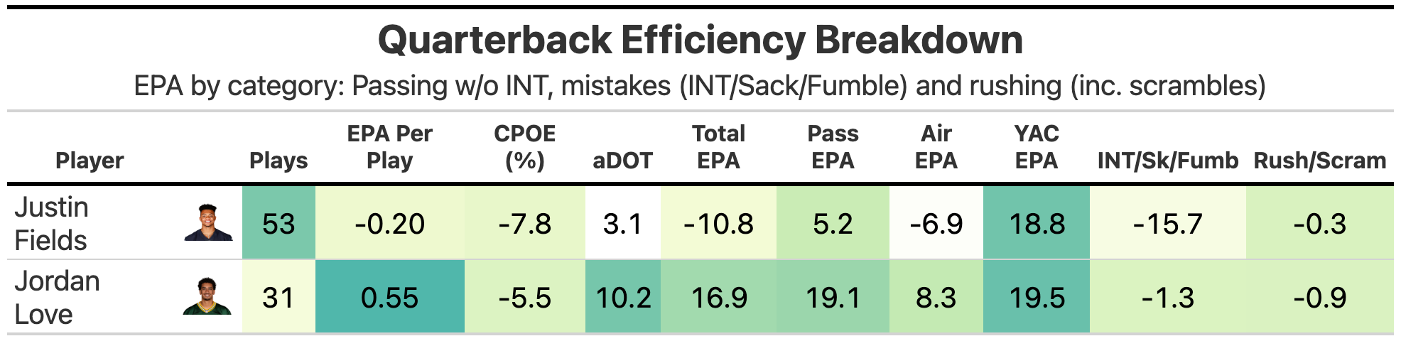 Jordan Love completed a 35-yard touchdown to Aaron Jones on 4th & 3, and converted 3rd downs needing 13, 10, 8, 8 and 6 yards. While the Justin Fields threw a pick-6 on 3rd & 11, failed to convert a 4th & 1, and was sacked twice on 3rd and less than five yards to go.