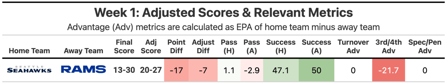 The Seahawks, at least offensively, were a bit unlucky on high leverage downs, converting only 2-9 late downs, while the Rans went 12-18, including 1-1 on fourth down. They were generally successful on a play-by-play basis, but couldn’t get the conversions and big plays to drive offensive points.