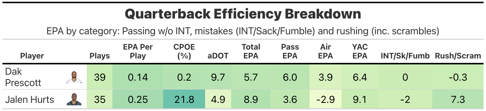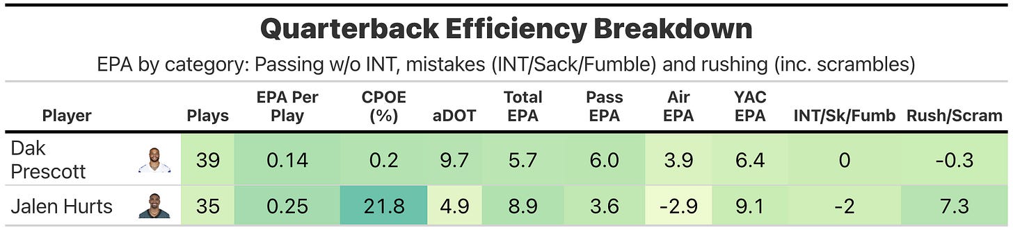 Dak Prescott looked much more impressive by the advanced stats than his pedestrian box score: +5.7 EPA versus 21/24, 188 yards and no touchdowns. Prescott boosted his numbers with key third down conversions early in the game, and his traditional box score ignores a 32-yard defensive pass interference gain (+3.2 EPA) on 2nd & 23 targeting George Pickens. Prescott was completely clean from a mistakes perspective, with zero turnovers and didn’t take any sacks.