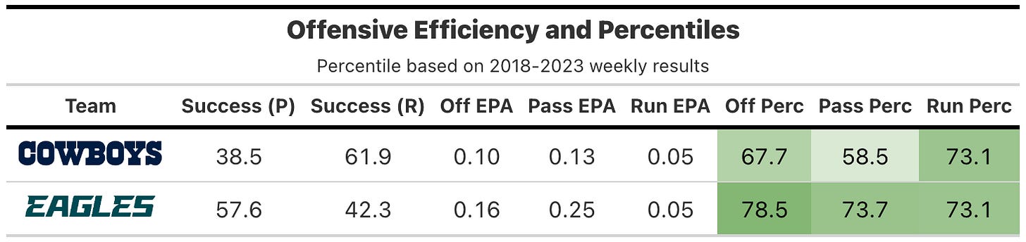 The Cowboys were highly successful running the ball against the Eagles, hitting the 73rd percentile in rushing efficiency (116 yards and two touchdowns on 21 designed runs, +0.05 EPA per), despite losing 5.8 EPA on the Sanders fumble. The harm Sanders caused by the fumble was somewhat mitigated by the 49 yards gained on the prior play (+3.7 EPA).