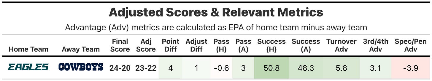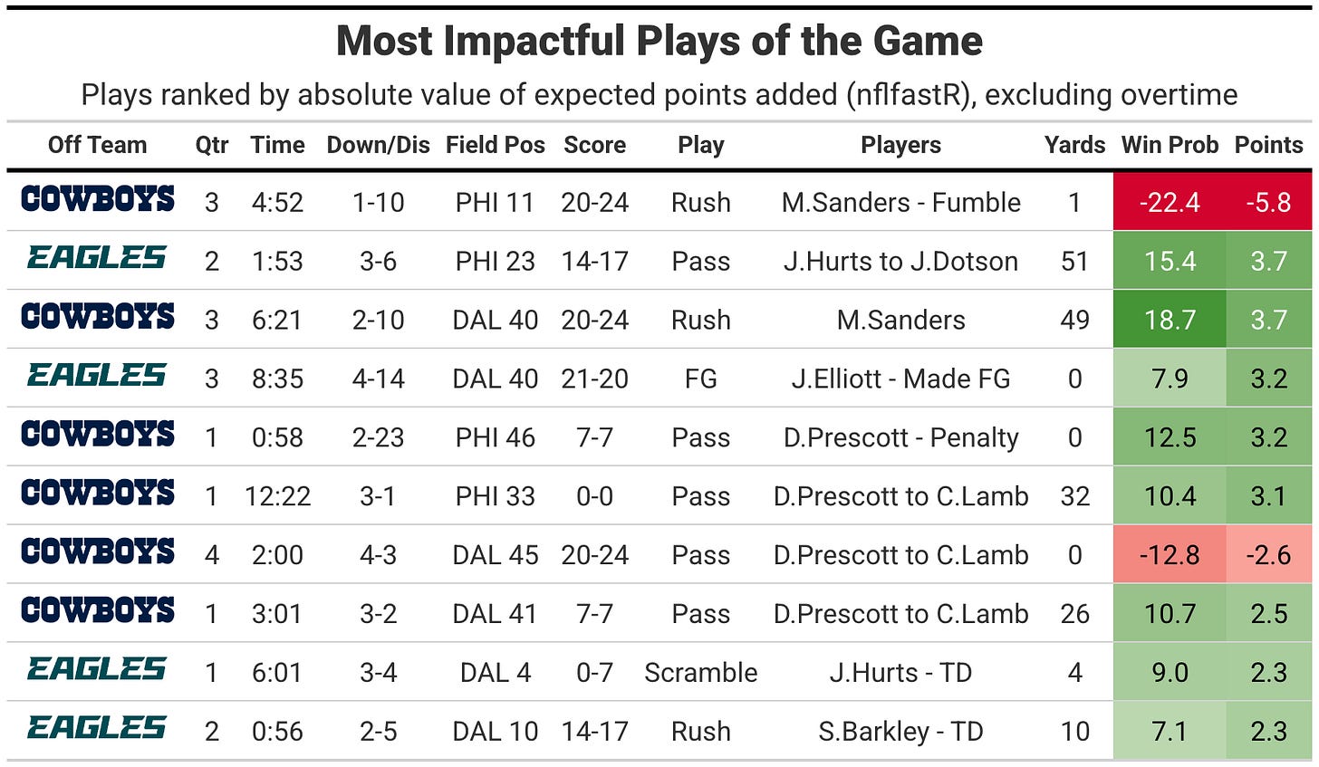 The adjusted scores saw this game as a bit more narrow than the actual scores. Both teams’ offenses performed at strong success rates, but the Philadelphia Eagles were able to convert one more of their scoring drives to a touchdown. As you see below in the game’s most impactful plays, the Eagles +5.8-point turnover advantage came from the biggest EPA swing play - the game’s only turnover.