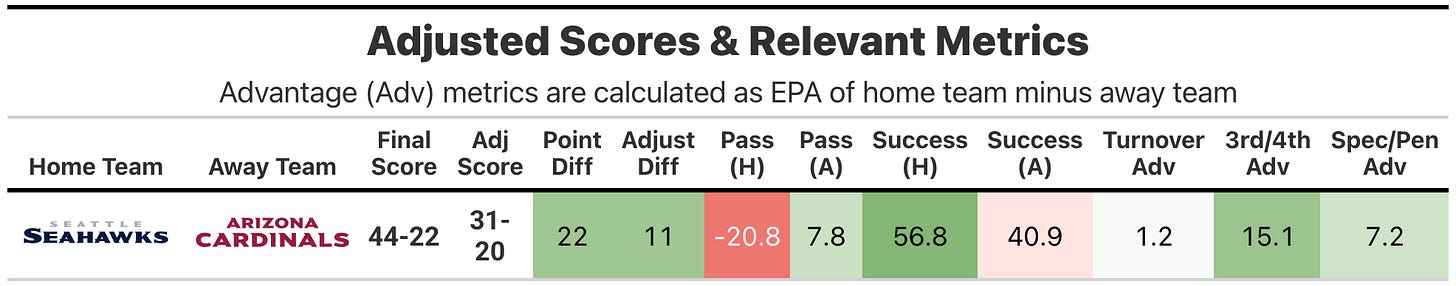 Another easy win for the Seattle Seahawks, sticking to their formula of ridiculous high dropback efficiency, though at a lower volume. They also held the Arizona Cardinals offense to a 41% offense success rate and forced two fumble-6’s.