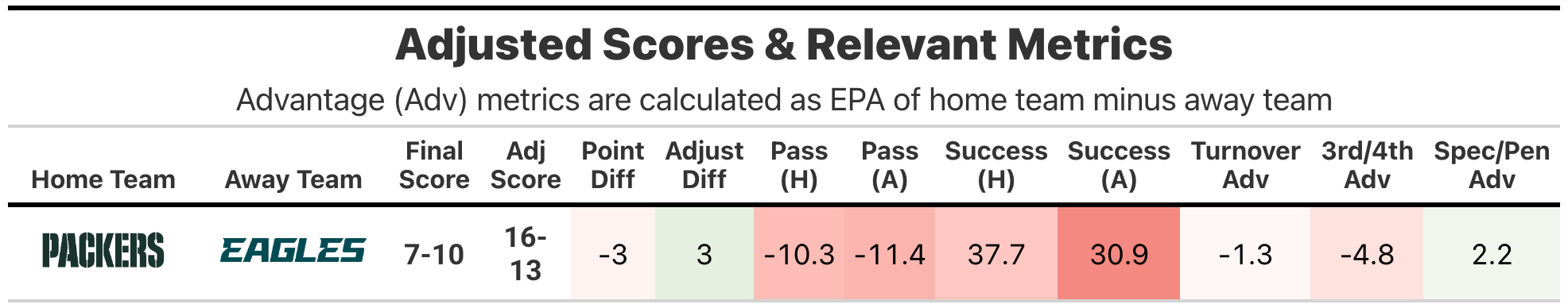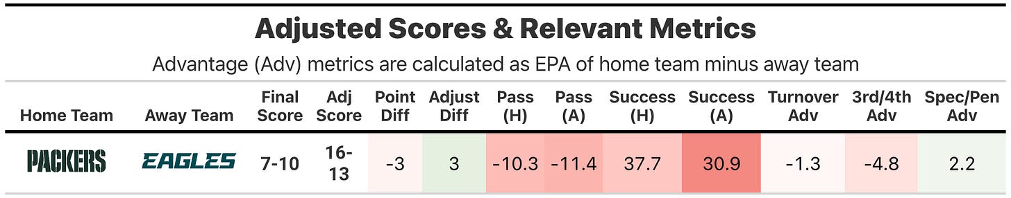 According to the adjusted scores, the Philadelphia Eagles were a bit lucky to get the win at the Green Bay Packers. It was a fairly even game, but the Packers had a marginally better offensive success rate (38% to 31%), but a couple big plays for the Eagles made the difference: a 41-yard completion to Saquon Barkley on 3rd & 7 (+4.0 EPA) and a 36-yard touchdown to DeVonta Smith (+3.5). The most valuable play the Packers offense made was a 4th & 1 conversion at only +2.1 EPA.
