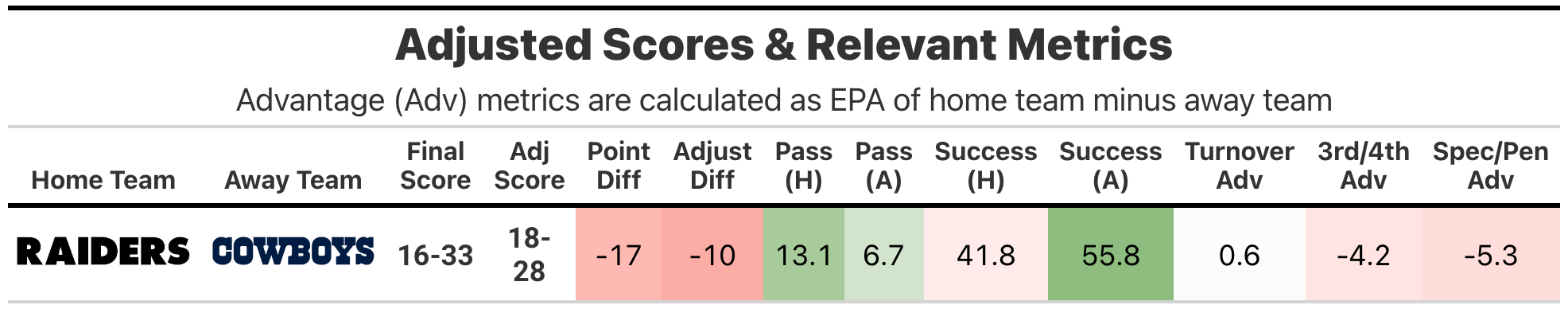 The Dallas Cowboys thoroughly dominated the Las Vegas Raiders, with all the advanced metrics decidedly in their favor. After a strip-sack fumble lost on the Cowboys’ second drive, they scored on the next five possessions, including four touchdowns that built out a 31-9 lead in the third quarter.
