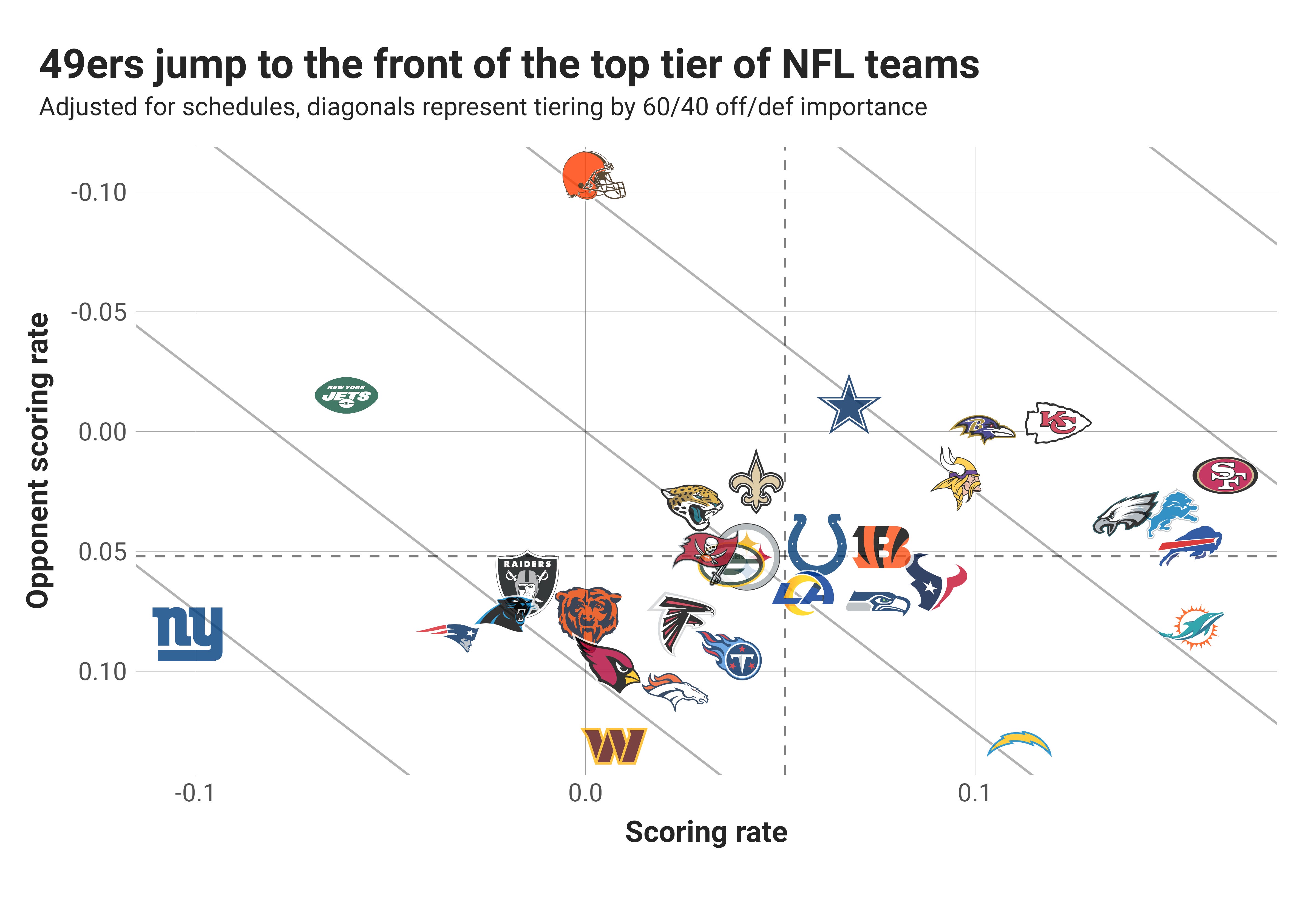 We still have a thick core of teams near the top of the power rankings, but the San Francisco 49ers have jumped to the top. They were second going into last week, despite the public perception that they had fallen so far with a three-game losing streak going into their Week 9 bye. By the adjusted scores, accounting for strength of schedule, the 49ers have the best offense in the NFL, and are solidly in the mix for second-best defense behind the Cleveland Browns. It’s a strong mix, but still far from a dominant team.