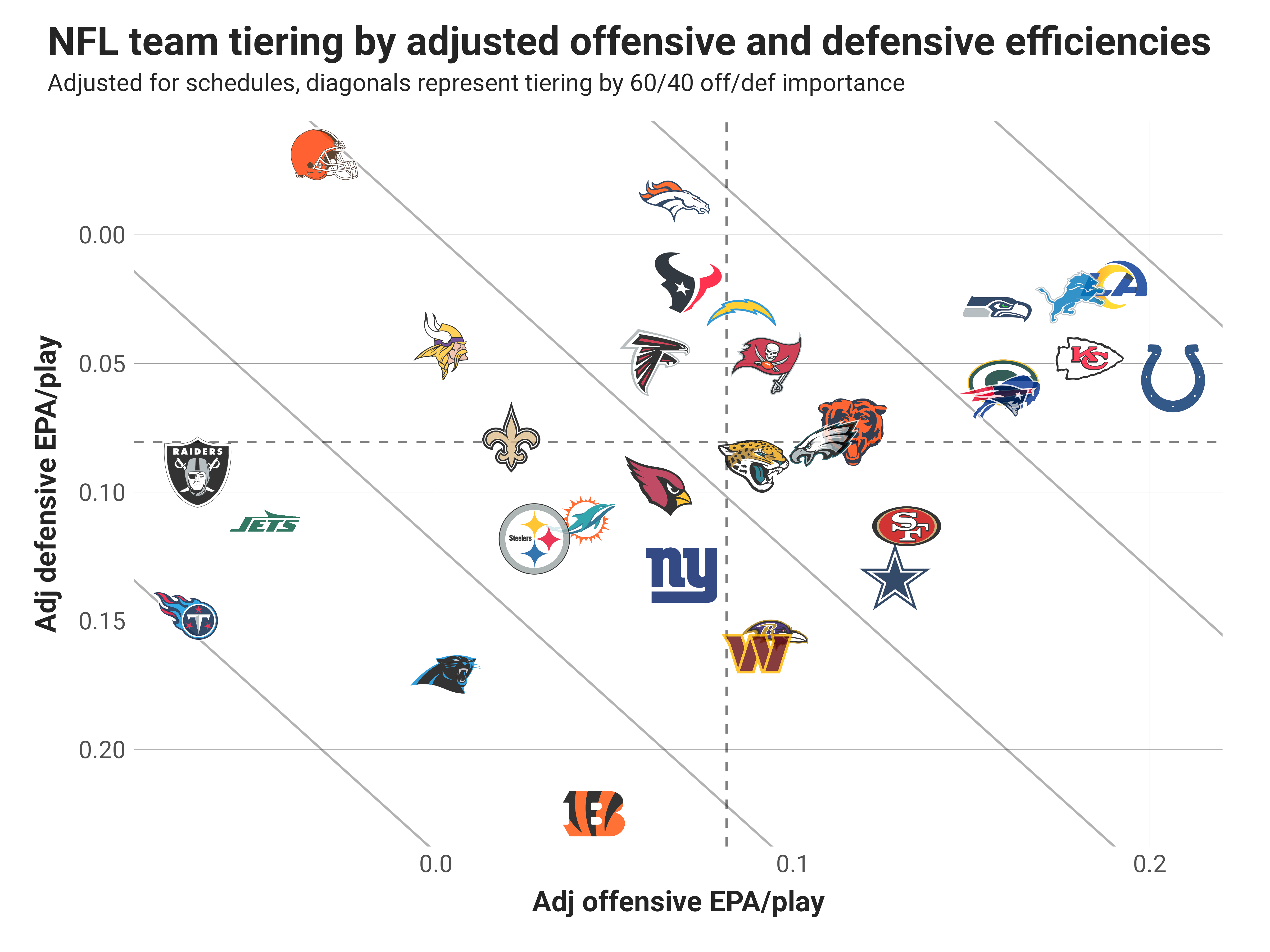 The New England Patriots are now officially in the top tier for 2025 performance, right on top of the Buffalo Bills and Green Bay Packers for adjusted offensive and defensive EPA per play. The Seattle Seahawks are a bit better defensively, and the Kansas City Chiefs remain in a similar position after their bye week.