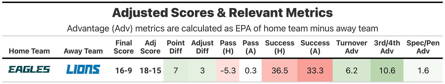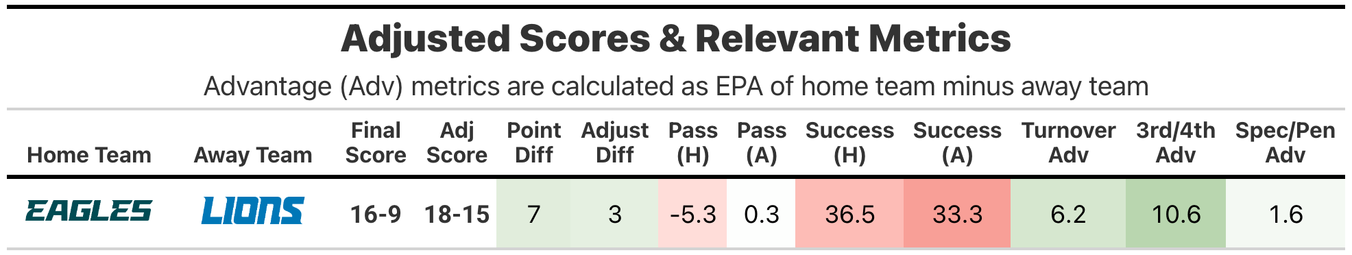 An offensive struggle-session for both teams ends in the Philadelphia Eagles taking down the Detroit Lions, which will prompt many in the media to place them ahead of the NFL power rankings. I doubt my team strength numbers will agree, with offensive performance being more important in projections, plus I’ll have more skepticism that the Eagles defense will be elite down the stretch, which is likely the default assumption for the crowd. This game wasn’t really a boost in projections for the winner’s offense, with both teams combining for 11 punts and six turnovers on downs.