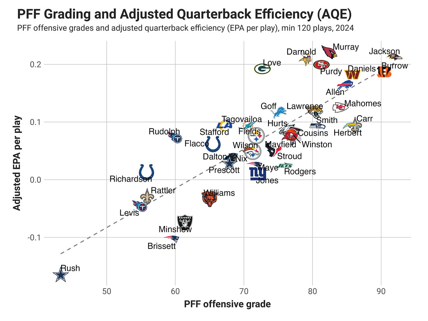 The plot below is a bit different than previous iterations of this post, substituting AQE for unadjusted EPA per play, and you might notice that the data has less dispersion (i.e. something like a higher r²) than using straight EPA. Even so, AQE doesn’t perfectly align with PFF grading, and you can decide which measure is more representative of fundamental quarterback play. (hint: it’s AQE!)
