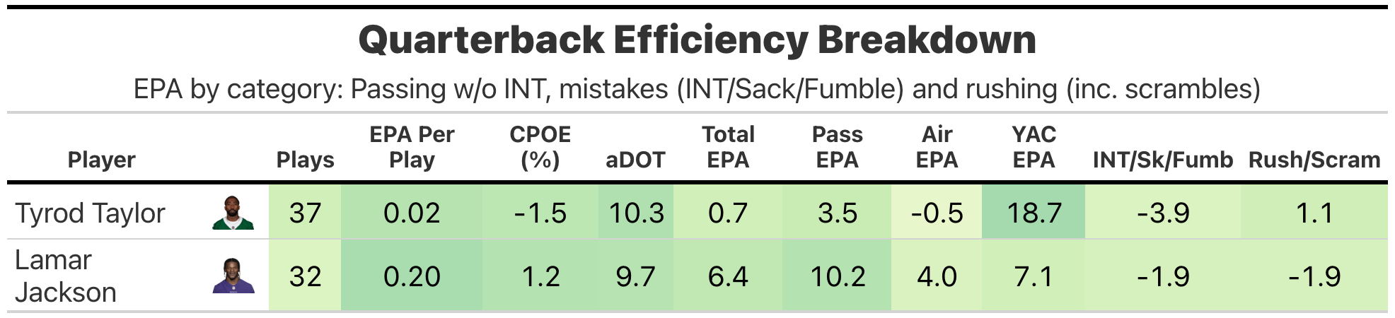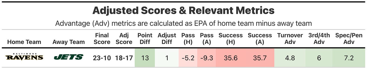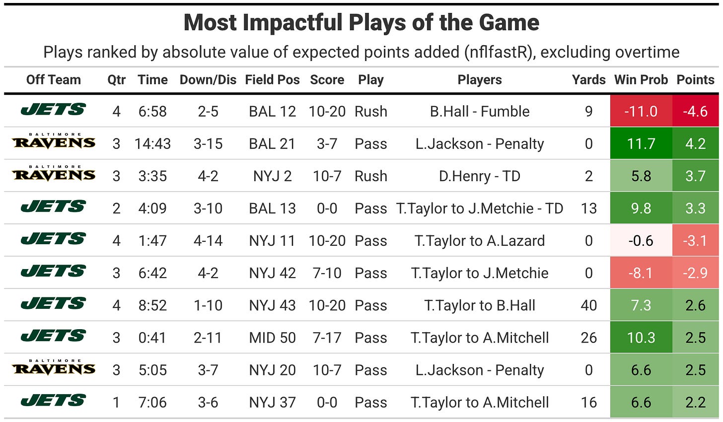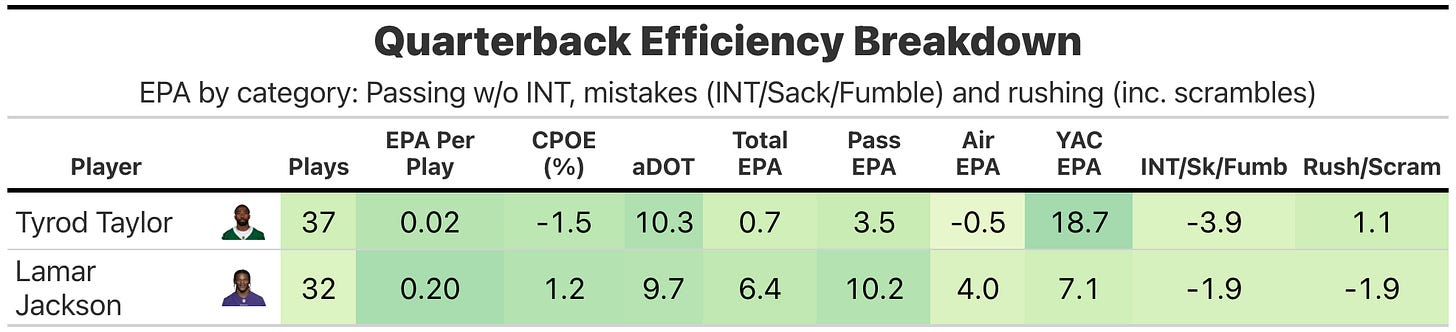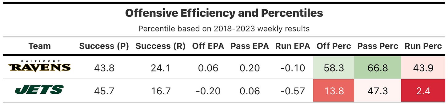 Both teams struggled to score early with the New York Jets leading the Baltimore Ravens 7-3 at halftime, before the Ravens took the second-half kickoff down for a touchdown and never looked back. Both teams had poor offensive success rates, but the Ravens were able to juice EPA efficiency to near the 60th percentile with some big penalty gains, key fourth-down conversions and protecting the ball.