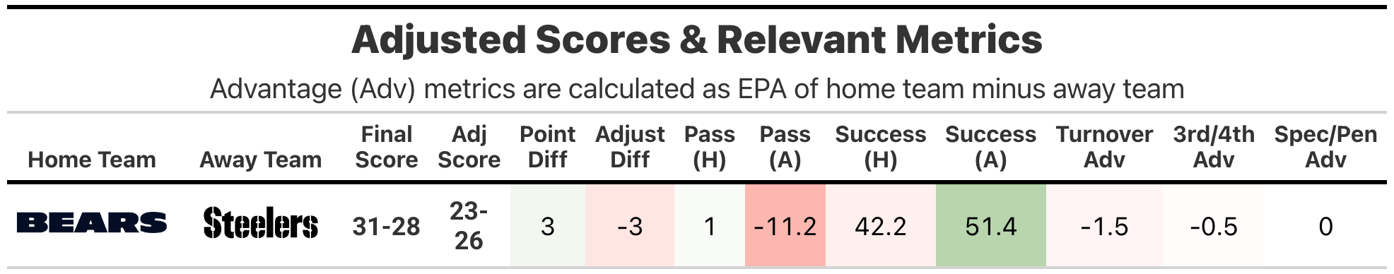 We have our first reversal of adjusted and actual scores, with the Pittsburgh Steelers ending up on the unlucky end, the opposite of what we saw a few times in the early season. The Chicago Bears got the three-point win despite an almost -10% differential in offensive success rate, and a lower EPA efficiency.