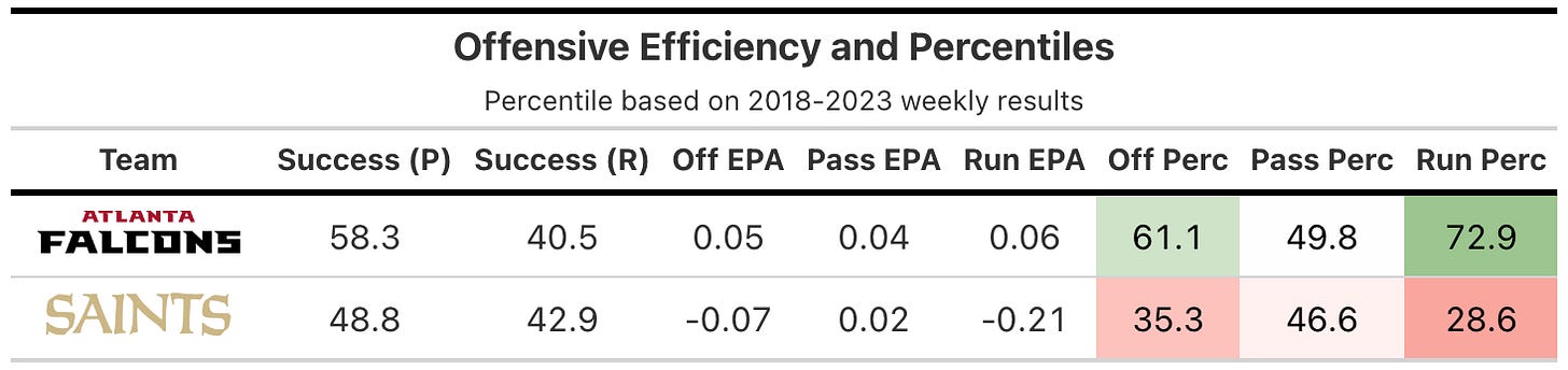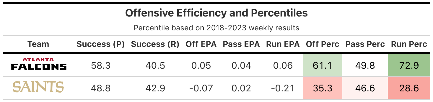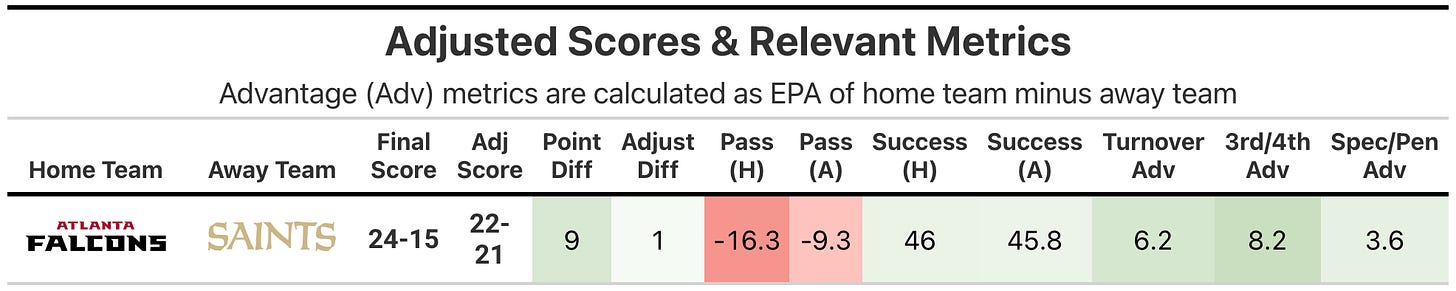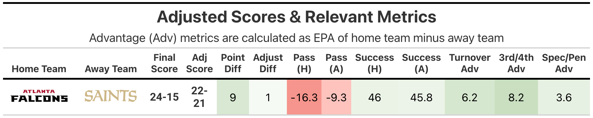 The Falcons get the nine-point win to take the lead in the mediocre NFC South, but the adjusted scores saw this as basically a draw. The two offenses had almost identical success rates, each team had two turnovers and Derek Carr outplayed Desmond Ridder. The Saints were viewed by the market as the stronger team going into this one, as a 2-point favorite in Atlanta.