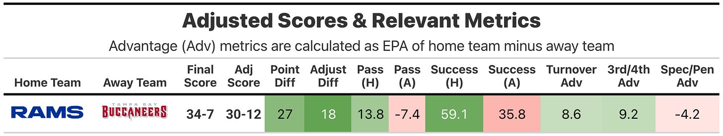 The fact that the adjusted scores came anywhere close to matching the actual point differential (18 versus 27) shows the dominance of the victory. The Bucs did have some fluky plays go against them, but the Rams offense effectively shut down in the final two quarters with a 31-7 halftime lead that put them above a 99% win probability.