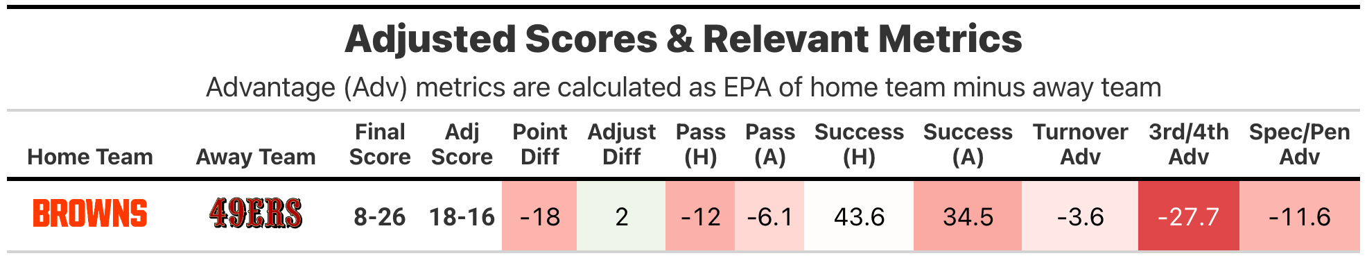 We have another flip between actual and adjusted scores, this time going from a dominant-looking 26-8 final line for the San Francisco 49ers to the fundamentals saying the Cleveland Browns were slightly better.