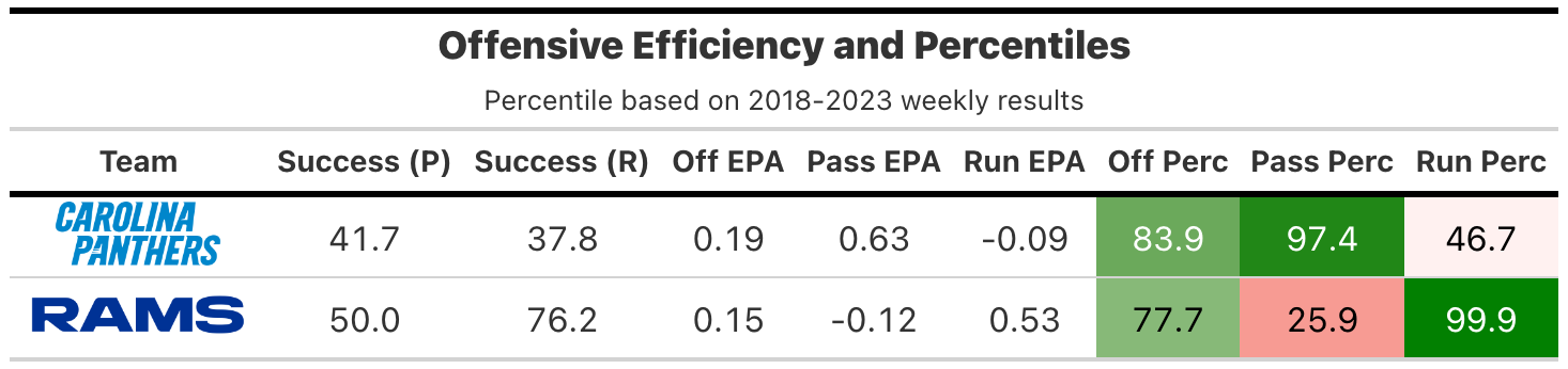 The headline difference comes in offensive success rate, with the Rams gaining expected points on an awesome 60% of plays, whereas the Panthers were below 40%. The Panthers ended up with slightly higher offensive EPA efficiency (84th percentile to 78th) due to a +3 turnover margin (+18.1 EPA) driving down the Rams offense and going 3-for-3 on fourth downs (+13.2 EPA).