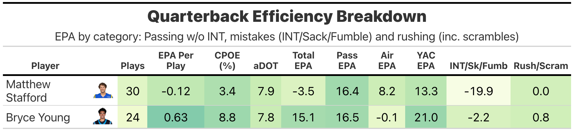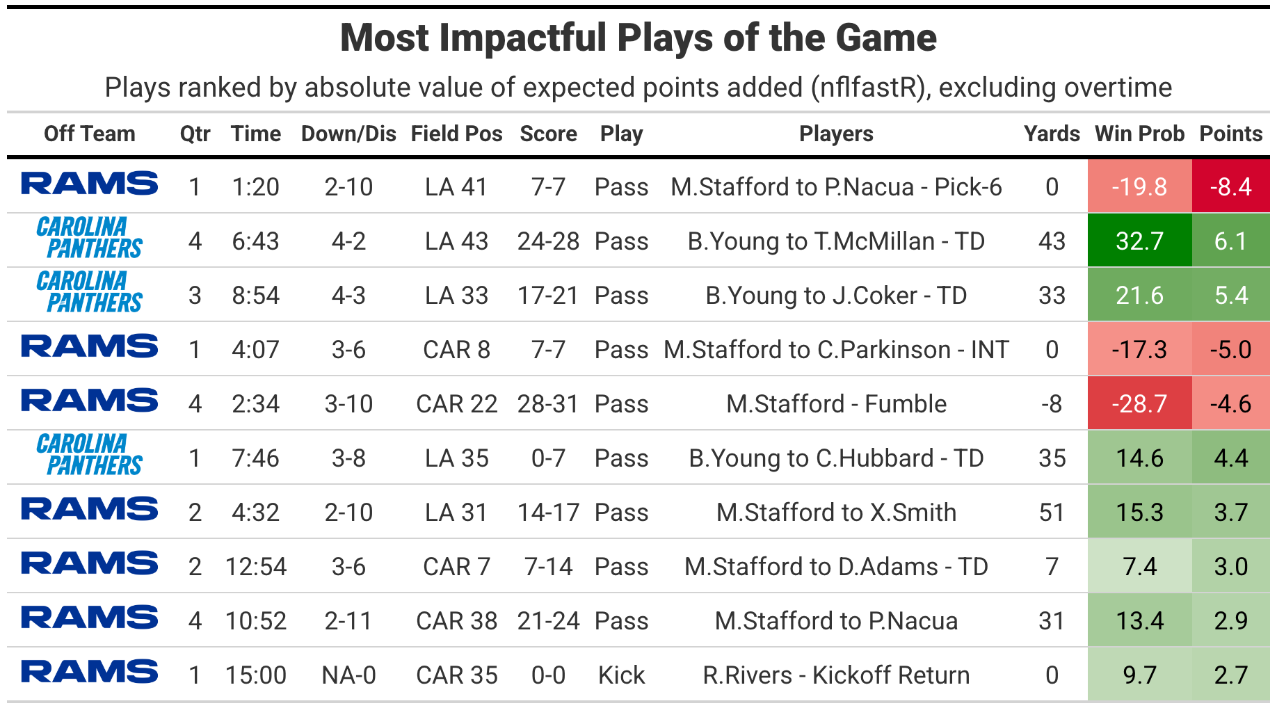 One of those Rams turnovers was a pick-6 registering as the biggest value swing of the game at a loss of -8.4 expected points. The Panthers got a number of big plays on late downs, including 43- and 33-yard touchdowns on fourth downs, plus a 35-yard scores on 3rd & 8. The Panthers were 7-for-15 on third downs (+5.0 EPA) versus the Rams at 2-for-5 (-5.9).