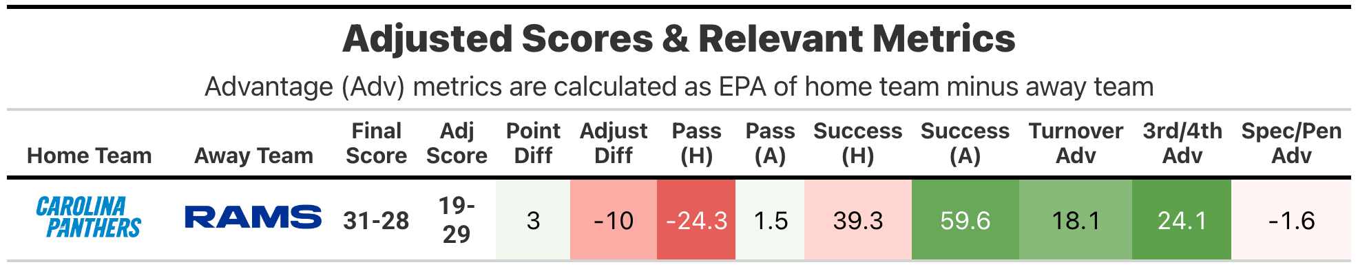 This has to be the biggest, or approaching the biggest swing between actual and adjusted scores, with the Carolina Panthers winning the game by three points, and the fundamentals pointing to the Los Angeles Rams being 10 points better.