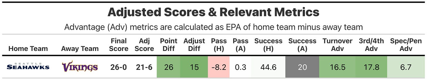 Things went predictably poorly for the Minnesota Vikings offense with 24-year-old rookie Max Brosmer making his first start. The Seattle Seahawks defense feasted, holding the Vikings to the lowest success rate of the season (20%) and collecting five turnovers (total 22 expected points).
