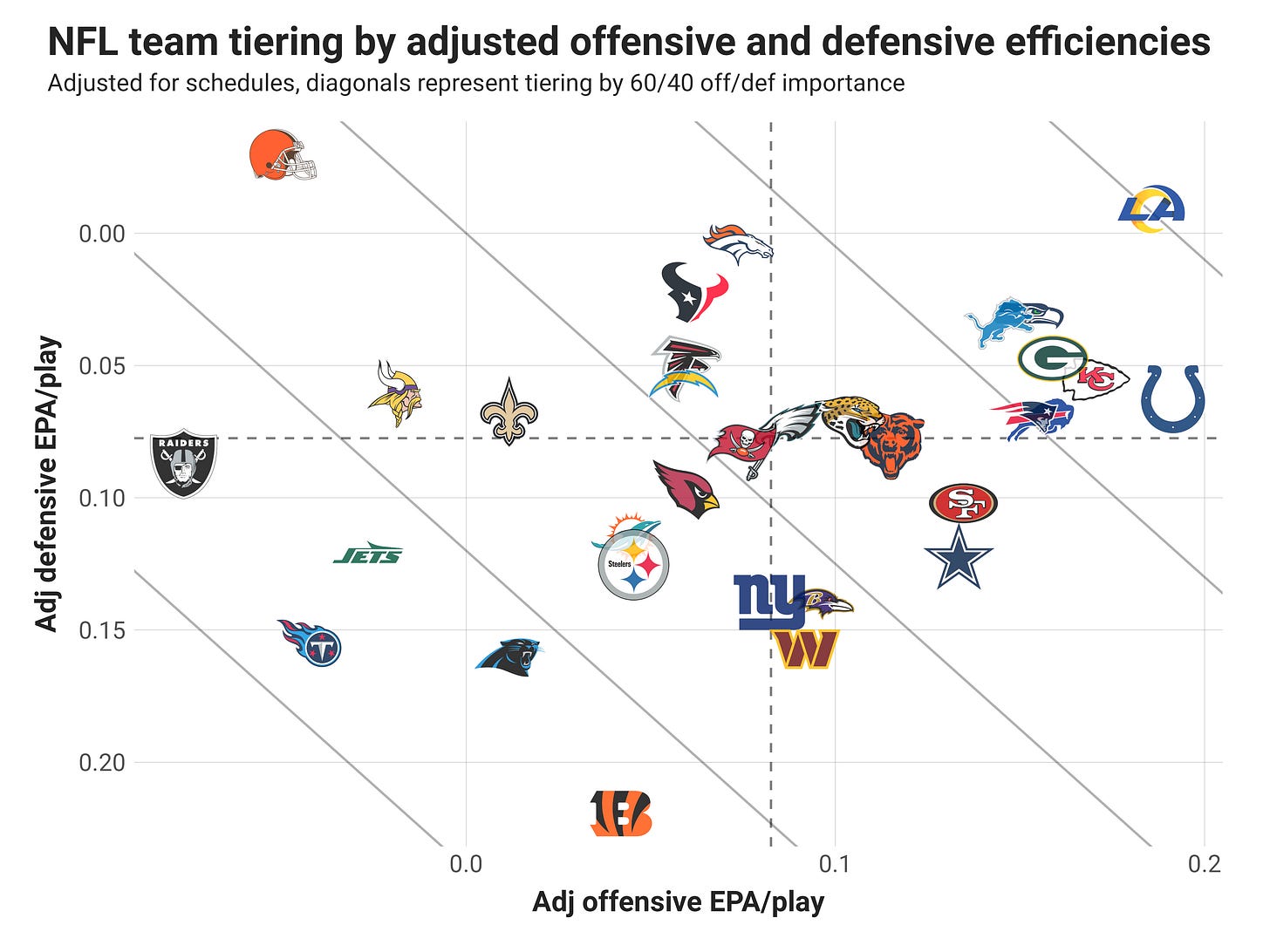 In this post, I’m going to walk through how my team-strength model views every team offensively and defensively for their 2025 performance going into Week 13, plus comparisons of my numbers to those derived by looking out over the next two weeks on the betting markets.