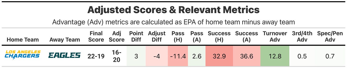 If you like field goals, fumbles and interceptions, you loved watching this game. There were nine field goals, five fumbles (three lost) and five interceptions combined in the game. The Eagles got the worst of things, with the only miss among 10 field goal attempts, and losing five of the eight turnovers. The Chargers enjoyed a +12.8 EPA effect from that turnover differential, ultimately making the biggest difference in which team won the game.
