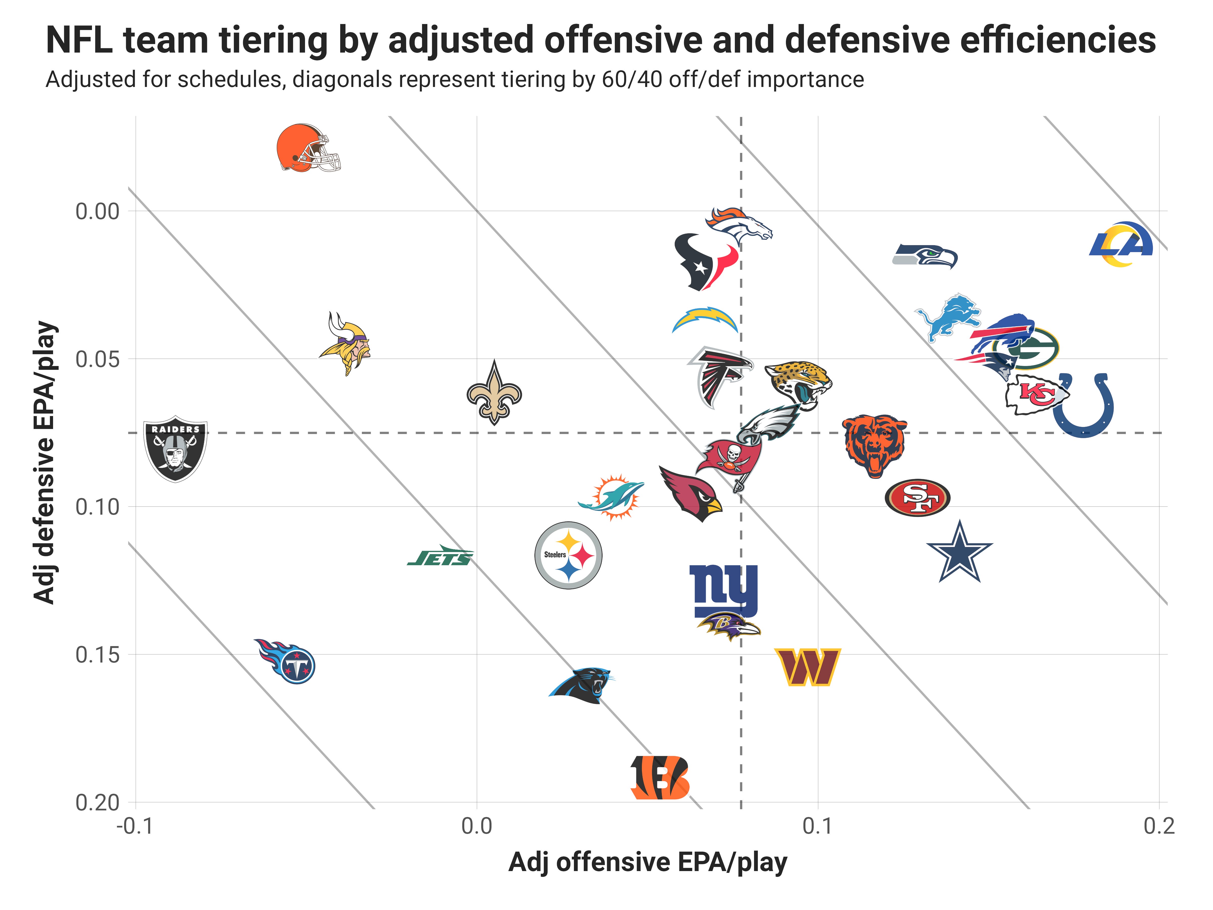 The Los Angeles Rams maintain their lead over the rest of the NFL, even after losing to the Carolina Panthers on Sunday. My adjusted scores had the Rams as fundamentally the significantly better team, moving an actual -3 point differential to +10 in their favor. Why? Well, their offensive success rate was more than 20% higher (60% to 39%), but turnovers and horrendous late-down success drove down their EPA efficiency to below that of the Panthers.