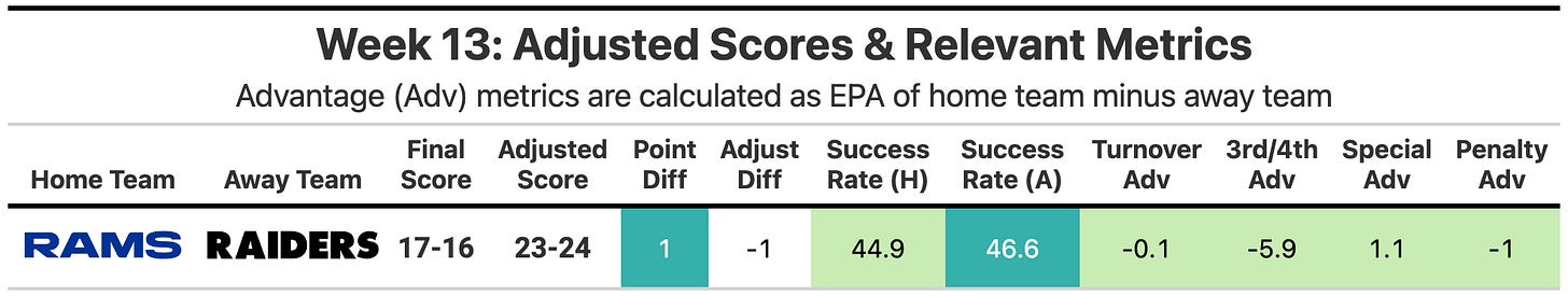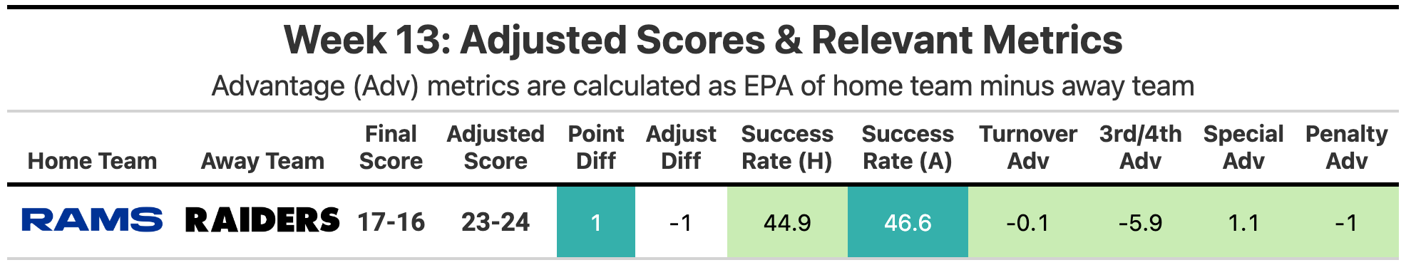 The adjusted scores lean slightly toward the Raiders being the better team this game, and I think most watching would agree that they never should have allowed the Rams to be in position to steal it at the end. The Raiders were in a shell offensively the entire game, ending with a 40% dropback rate in comparison to the Rams at 69% (very nice).