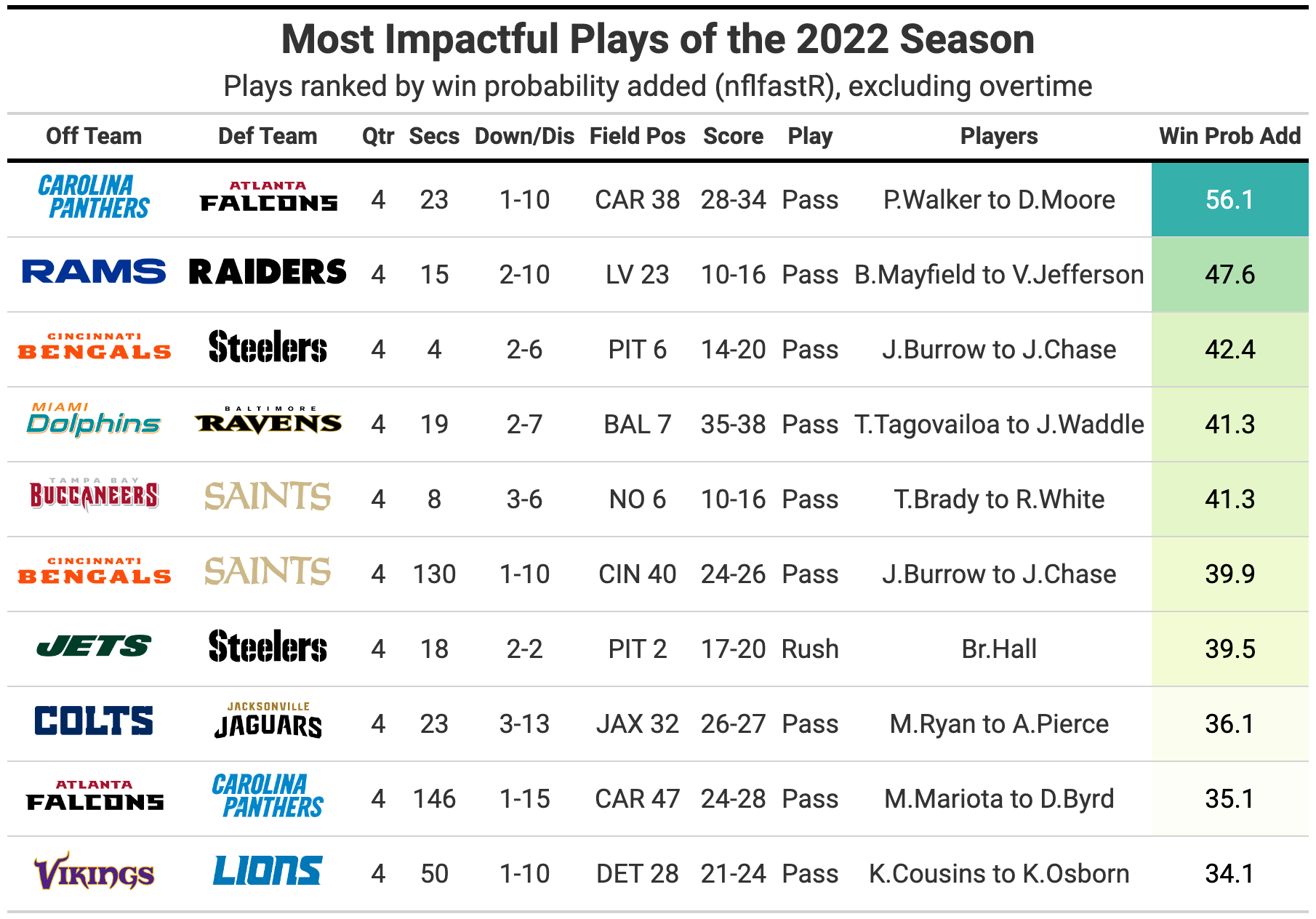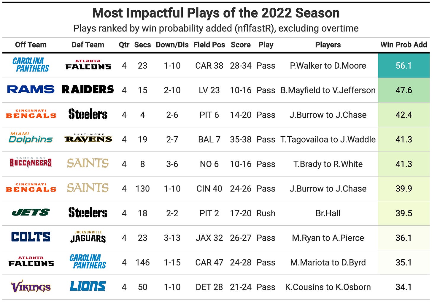 Accuracy caveats asides, the late Rams score was second highest play in WPA this season by the model, behind only the miracle heave from P.J. Walker to D.J. Moore against the Falcons, which didn’t result in a win after a failed extra point and overtime.