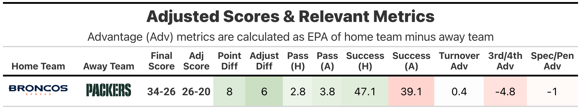 The adjusted scores quantify team play quality, with emphasis on stable metrics (success rate) and downplaying higher variance events (turnovers, special team, penalties, fumble luck, etc). Adjusted expected points added (EPA), in conjunction with opportunity-based metrics like total plays and drives, projects adjusted points. Adjusted scores have been tested against actual scores and offer slightly better predictive ability, though their primary benefit is explanatory.