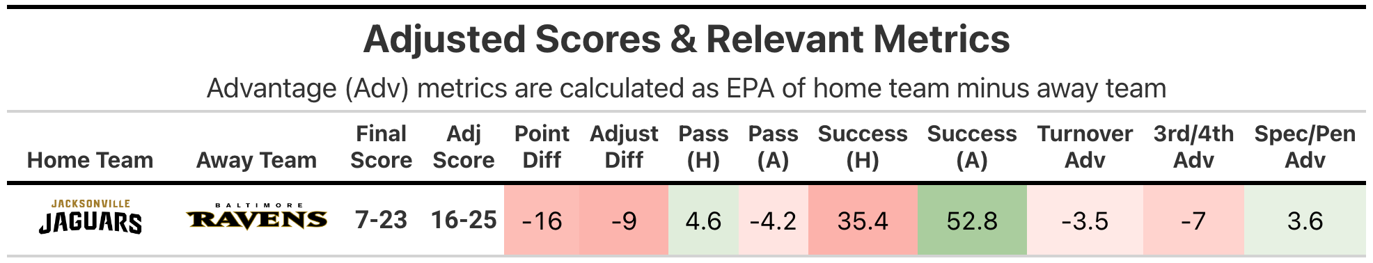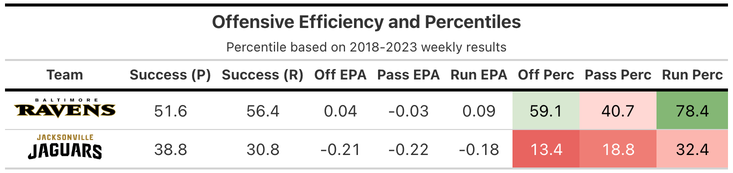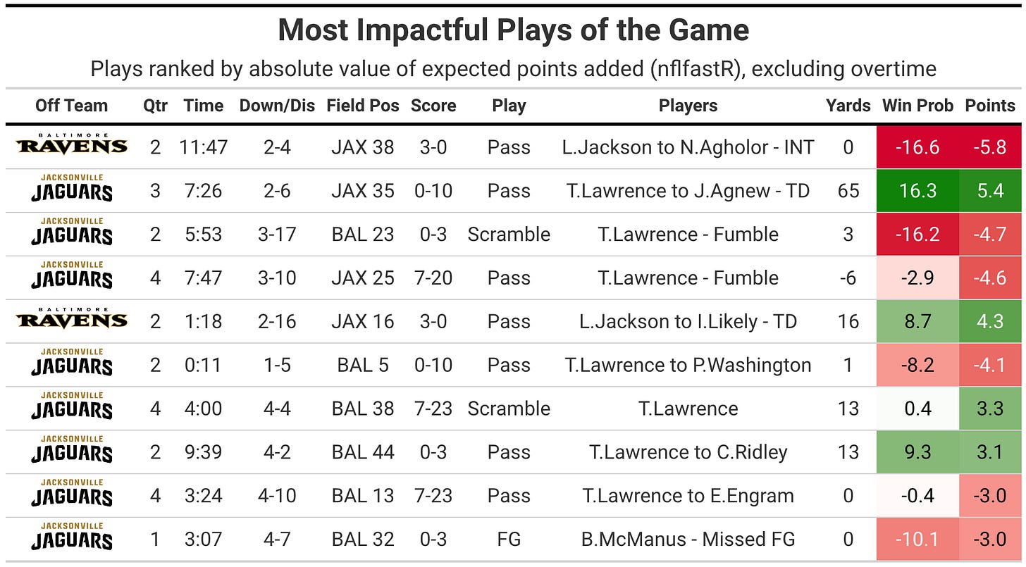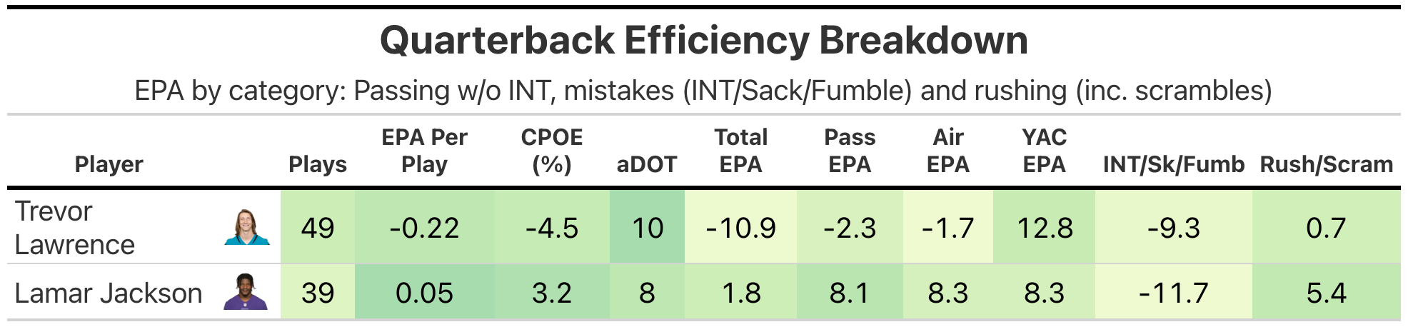 It’s not surprising from anyone watching that Lawrence had bad numbers in this game, but it might be unexpected to see that Jackson’s efficiency was average, at best, even losing EPA in total when dropping back to pass. The completeness of the Ravens passing defense is illustrated by Lawrence’s -2.3 EPA on pass attempts, which excludes the negatives from his fumbles and one sack taken. Whenever the ball left his hand the Jaguars were losing value.