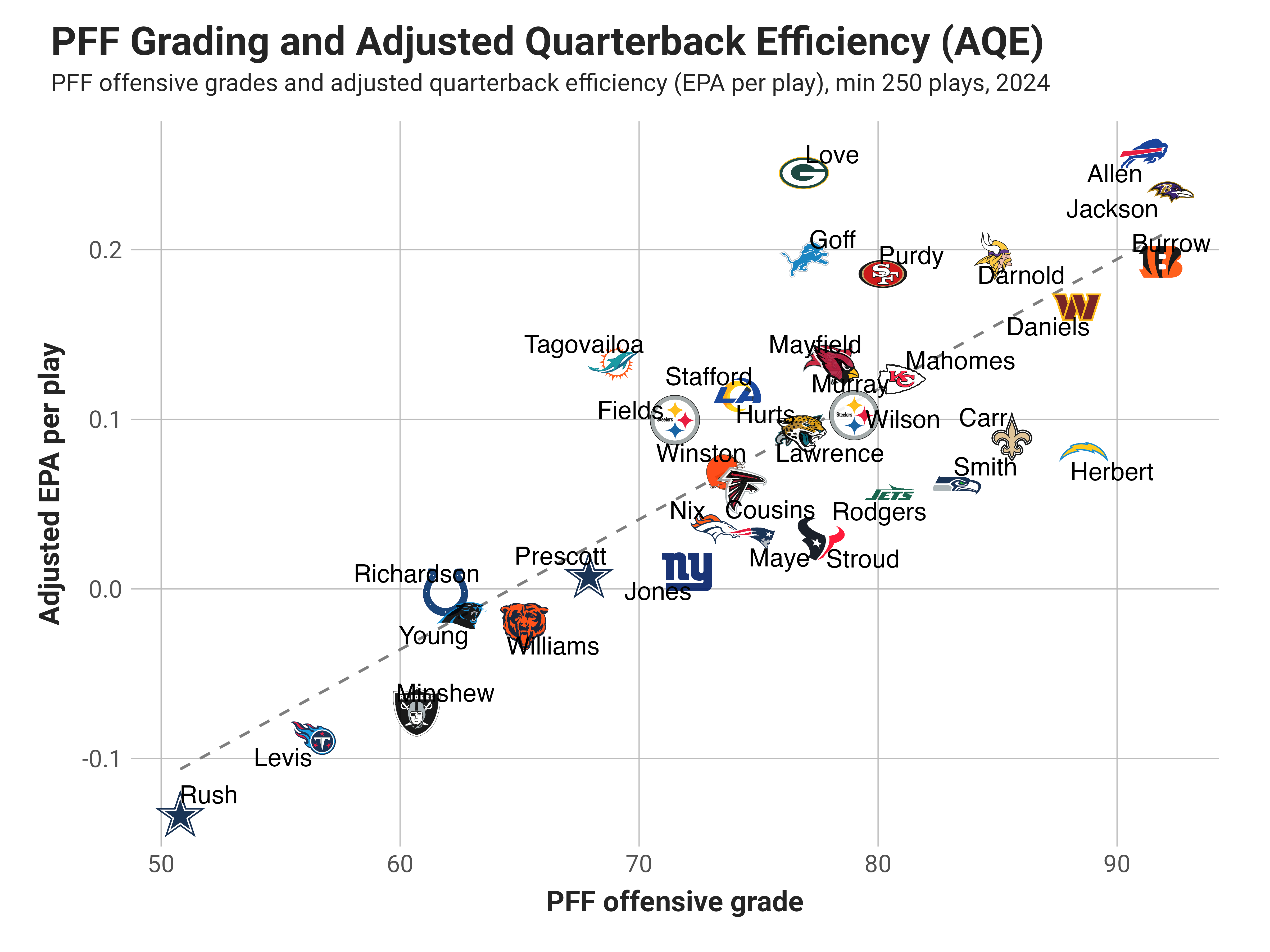 The plot below is a bit different than previous iterations of this post, substituting AQE for unadjusted EPA per play, and you might notice that the data has less dispersion (i.e. something like a higher r²) than using straight EPA. Even so, AQE doesn’t perfectly align with PFF grading, and you can decide which measure is more representative of fundamental quarterback play. (hint: it’s AQE!)
