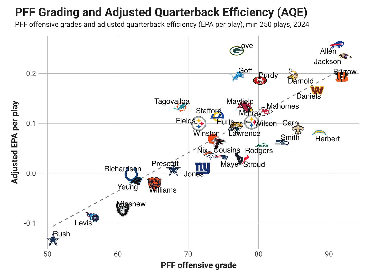 PFF grades aren’t part of the analysis, but I find it helpful to make not of how they align with EPA per play, as many contextual elements of quarterback play (drops, interception-worthy throws, easier throws that become big gains, etc) are part of the grading methodology, but aren’t accounted for in EPA. At the same time, I think EPA does a vastly superior job of weighing what is and isn’t important in points-based results.