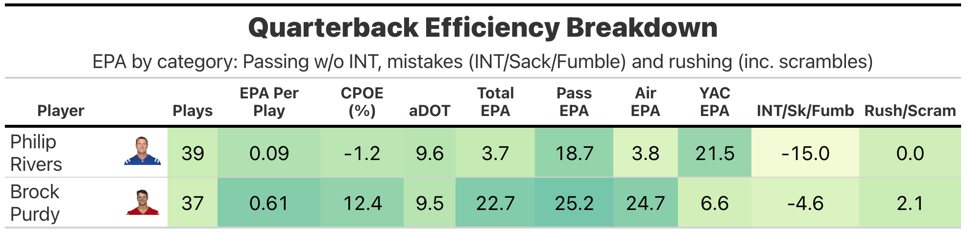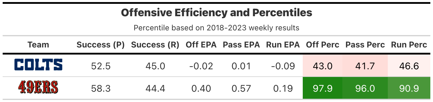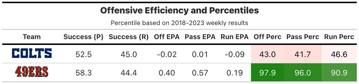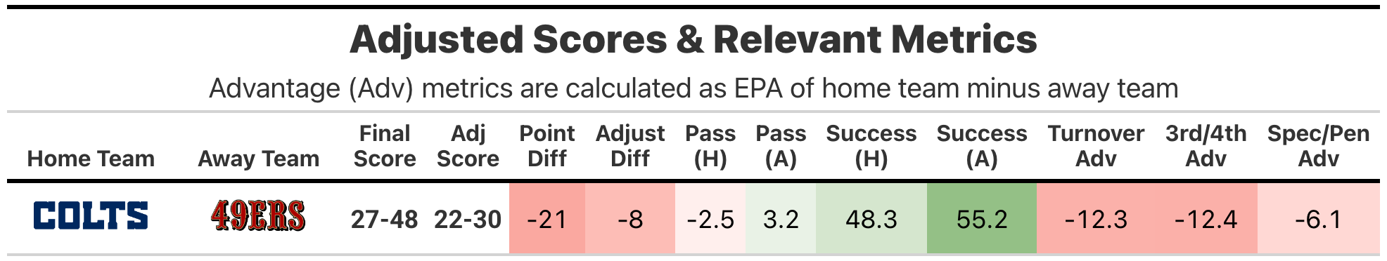 The San Francisco 49ers offense is hitting high gear just in time for the postseason, throttling the Indianapolis Colts defense on the way to a 48-27 victory. The adjusted scores didn’t see it as that dominant of a win, primarily because of the extra points the 49ers put on the board from a pick-6 (+10.6 EPA) and fumble recovery on a kickoff (+5.9 EPA) that led to a touchdown.