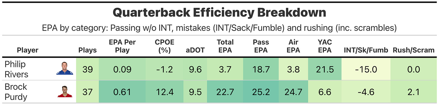 TD-INT ratio worshippers will love Brock Purdy’s 5-to-0 in this game. Purdy doesn’t have the volume and play-time this year to be considered for things like MVP or All-Pro selections, but his EPA efficiency to outstanding, leading the NFL if you lower the play-involvement threshold to 250 (+0.31 to Jordan Love’s +0.29 and Drake Maye at +0.27).
