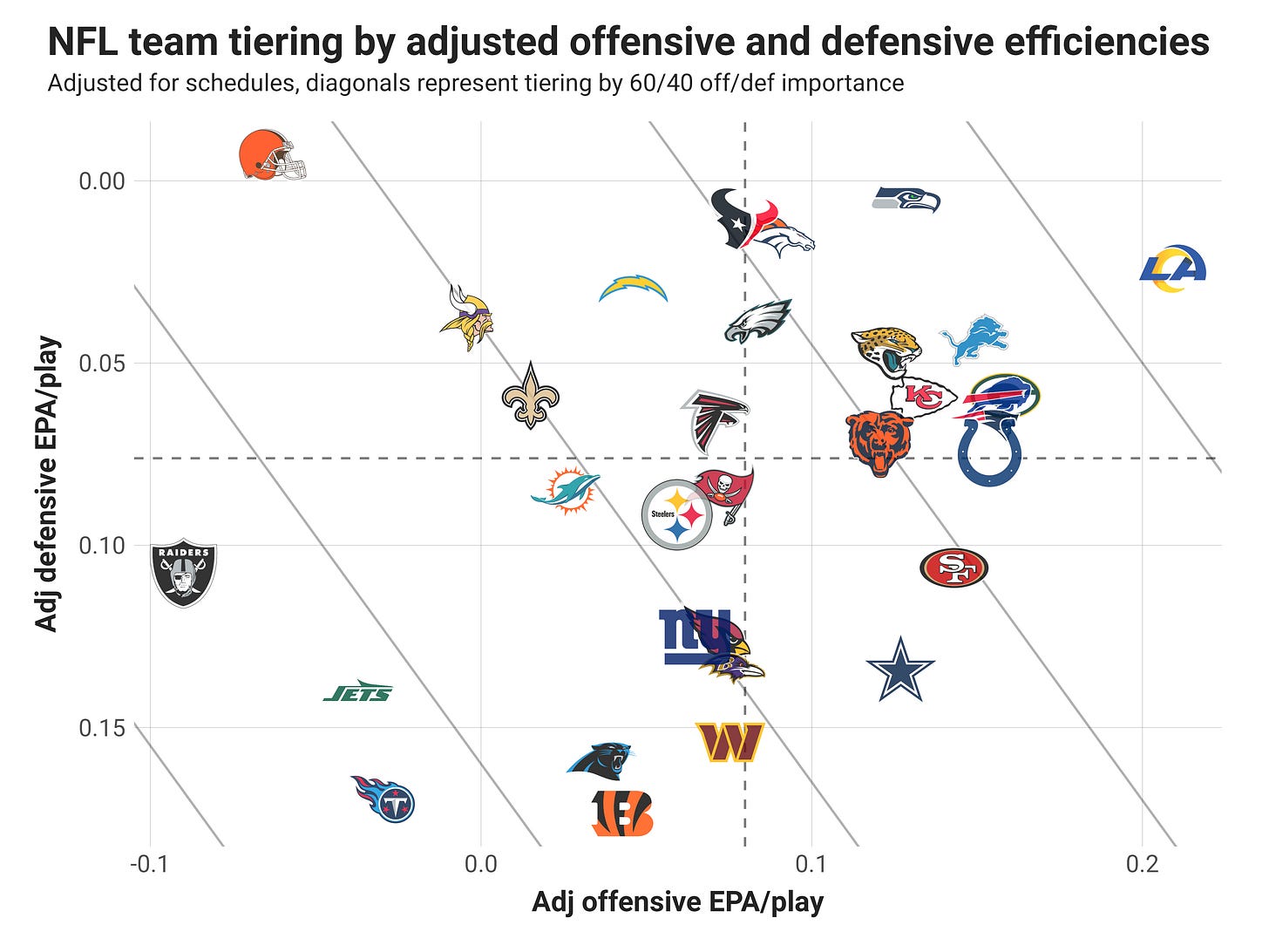 Below the Rams are around 10-15 teams without much separating them this season, though the prospects for the Indianapolis Colts to advance in the playoffs are now severely hampered by the loss of Daniel Jones. The same is now the case for the Kansas City Chiefs without Patrick Mahomes.