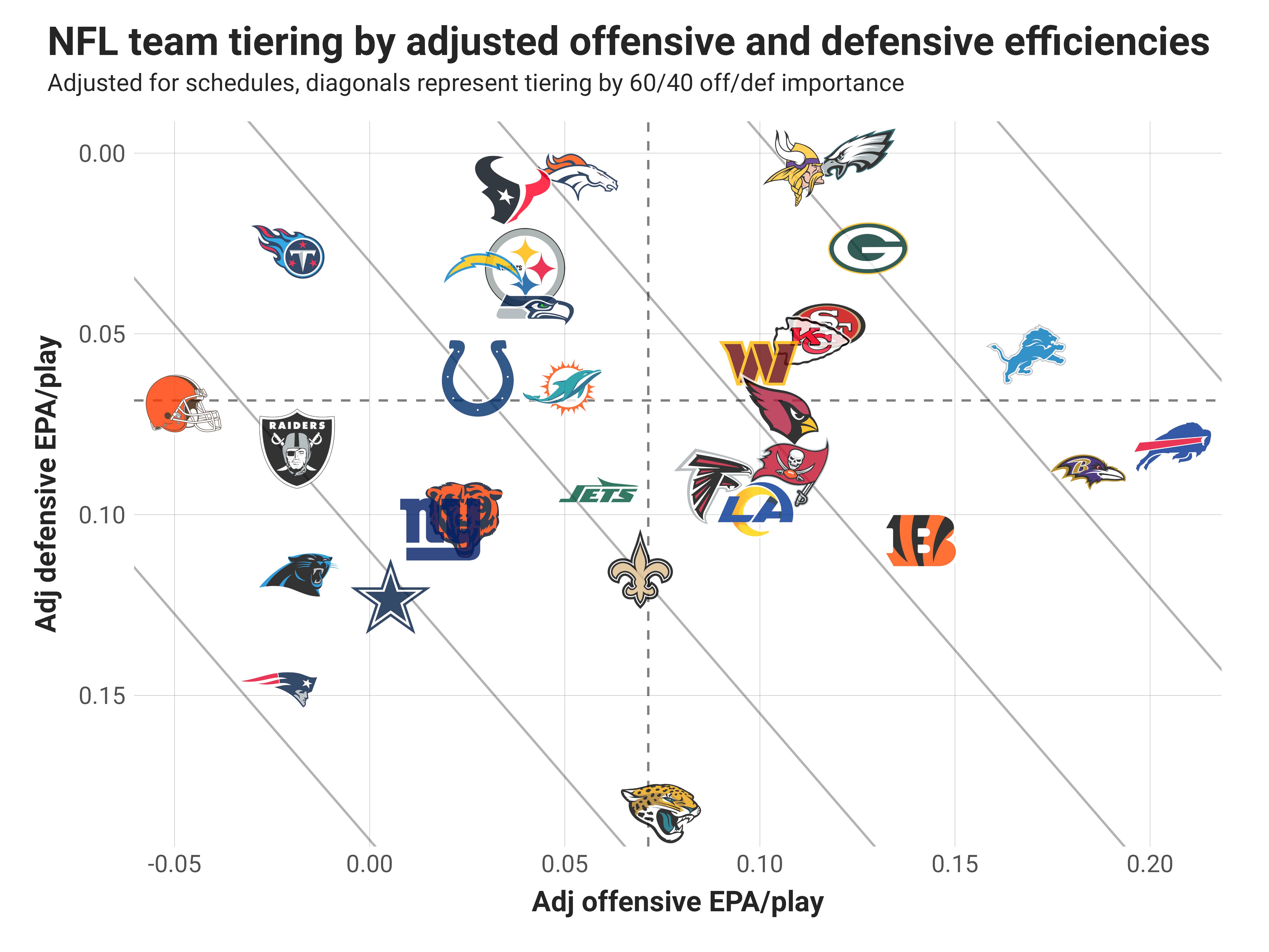 The Buffalo Bills are now, fairly clearly, the best team in the NFL by the adjusted-score based numbers. Yeah, their defense has been really bad the last couple weeks, but that can happen against great offenses, especially on the road. The Bills have a below-average defense, but they’re the best offense in the NFL.