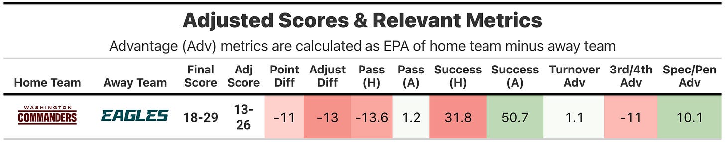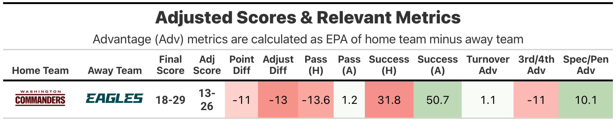 The Philadelphia Eagles survived especially poor special teams play to end up beating the Washington Commanders with relative ease. Those flukier special teams losses included two missed field goals (-5.4 EPA) and fumbling away the opening kickoff (-5.3 EPA), which explains why the adjusted scores reflect an even bigger victory.