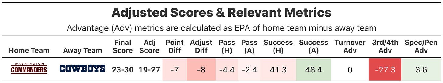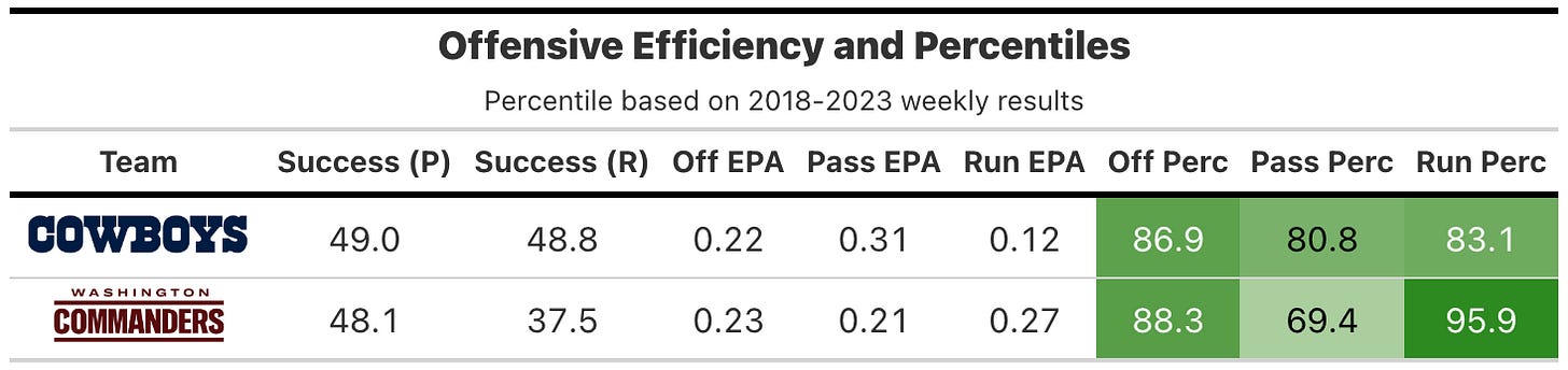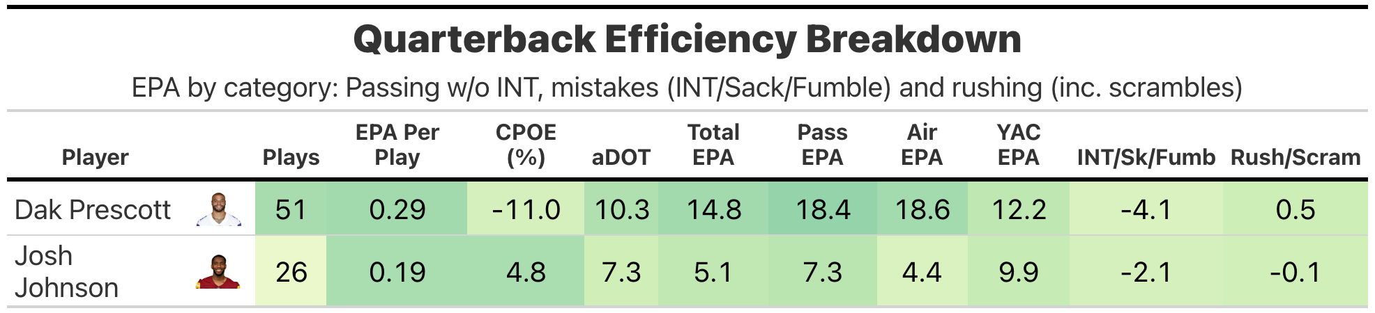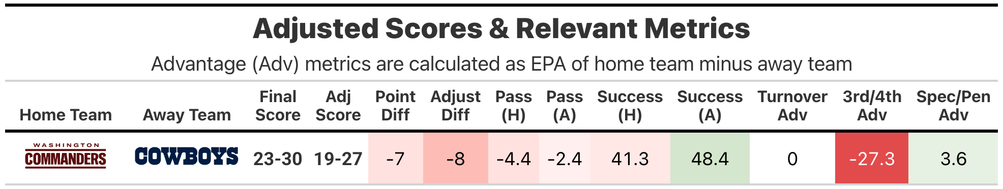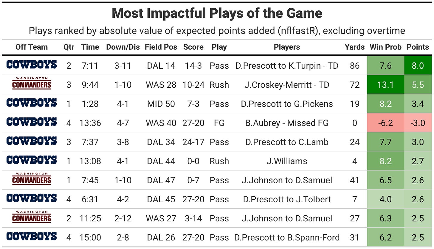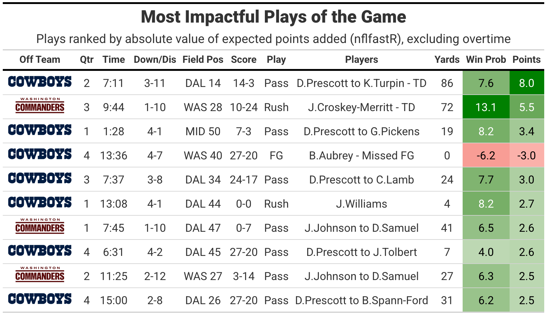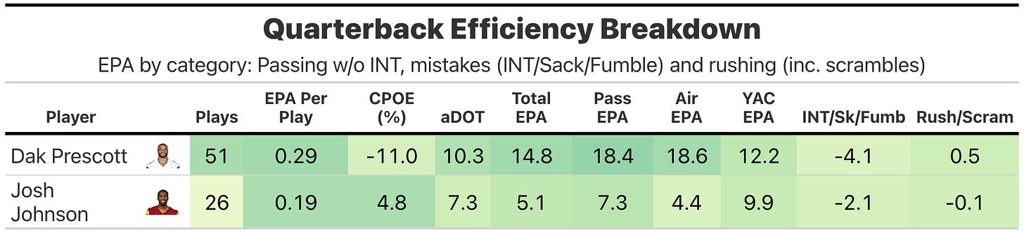 The Cowboys were significantly better in overall offensive success rate, but truly separated from the competition on late downs. The Cowboys converted 9-of-20 third downs (+9.8 EPA) and an incredible 6-of-6 on fourth downs (+11.0 EPA). The Commanders, on the other hand, failed on all but one of their third down attempts (-6.5 EPA).