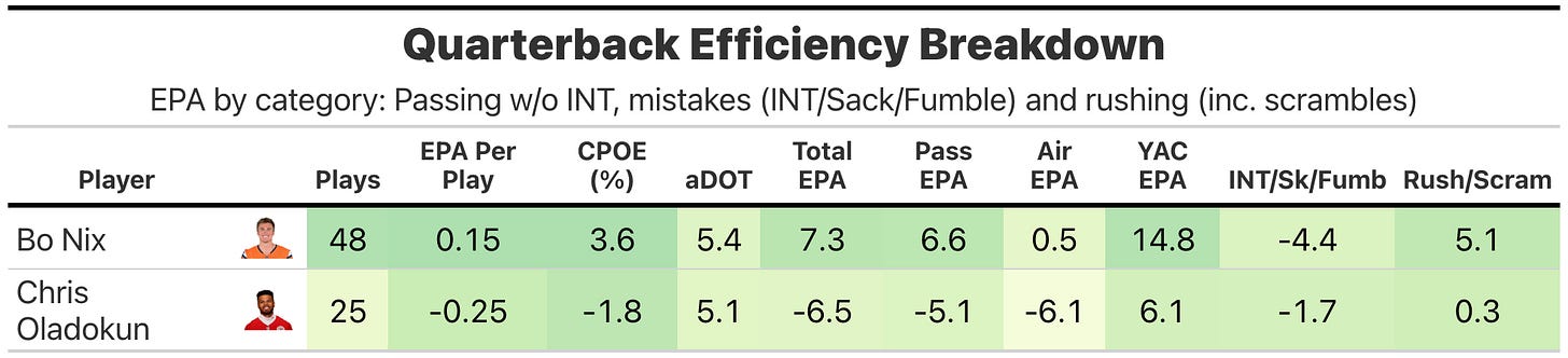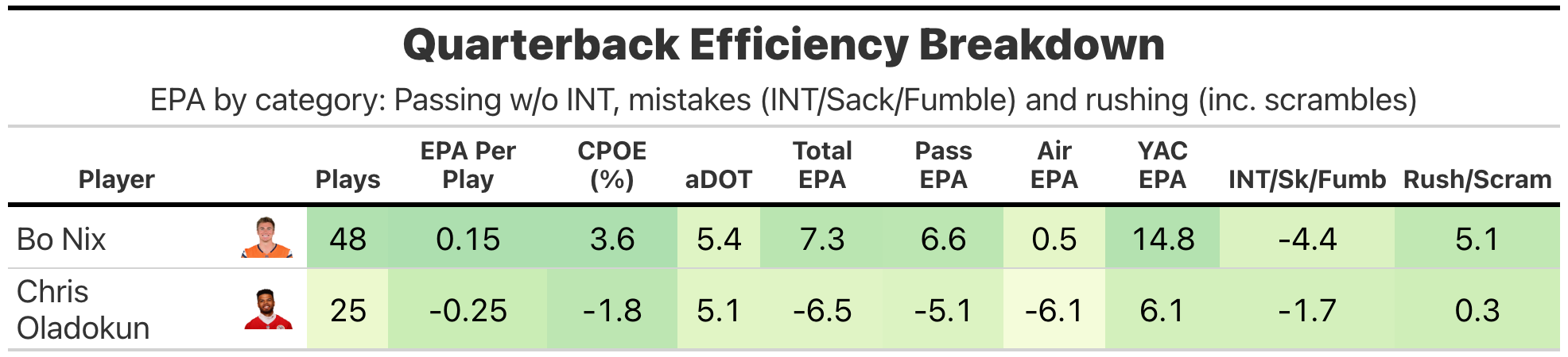 Despite averaging only 4.8 yards per pass attempt and throwing a pick, Bo Nix finished with decent EPA efficiency, with key rushing value and good third-down conversion success.