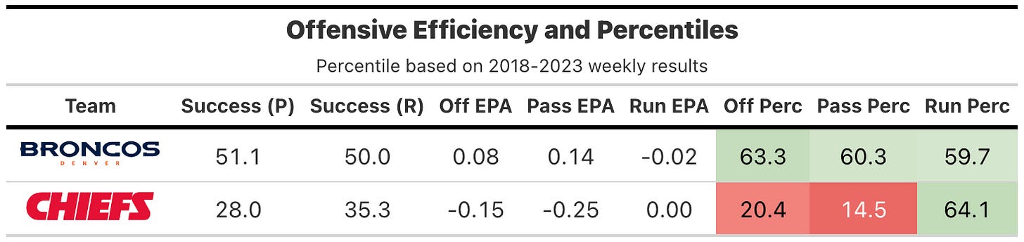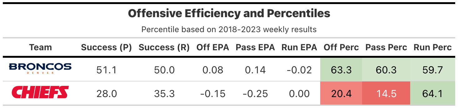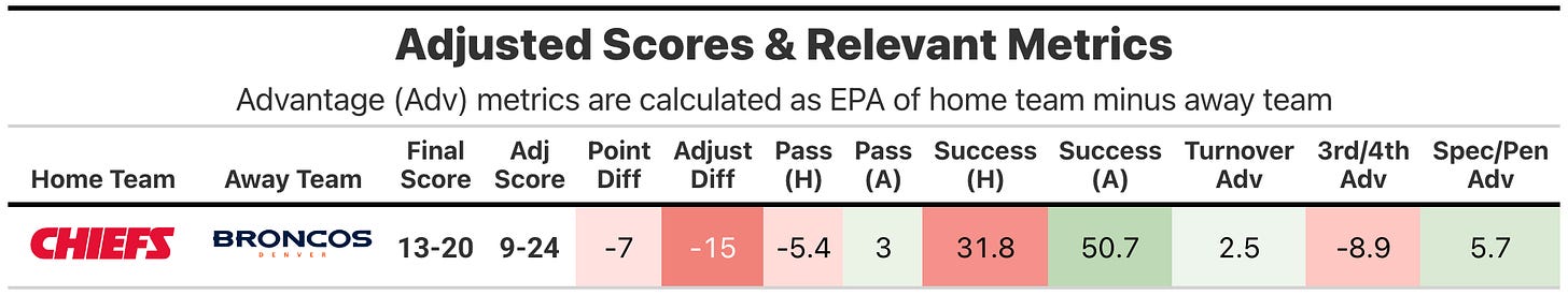 The Denver Broncos had been one of the luckier teams in results versus adjusted scores, but not in this win over the Kansas City Chiefs. The vast difference in offensive success rates pointed to a stronger win for the Broncos than the actual seven-point differential, as none of the Chiefs three scoring drives required more than 35 yards gained, with strong special teams returns and a turnover giving them excellent field positions. The Broncos outgained the Chiefs 303 yards to just 139, with 57 yards in penalties on the Broncos helping somewhat to close the gap.