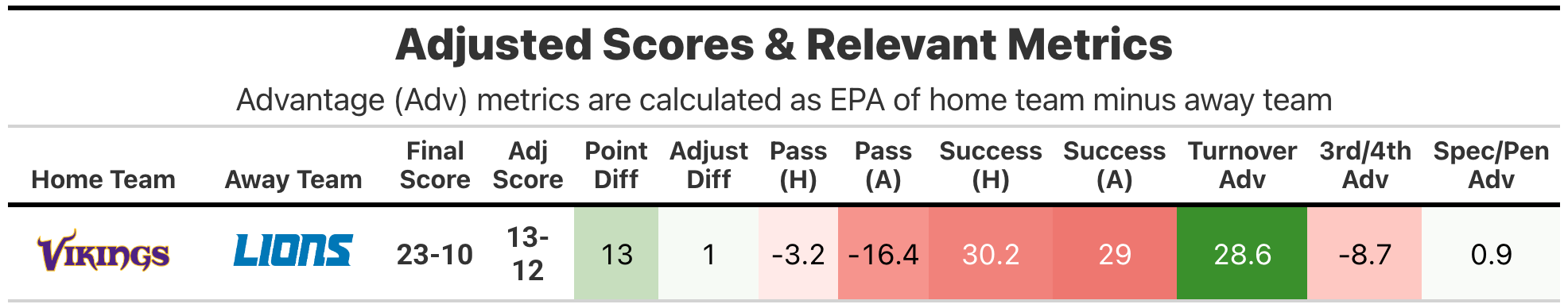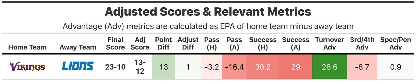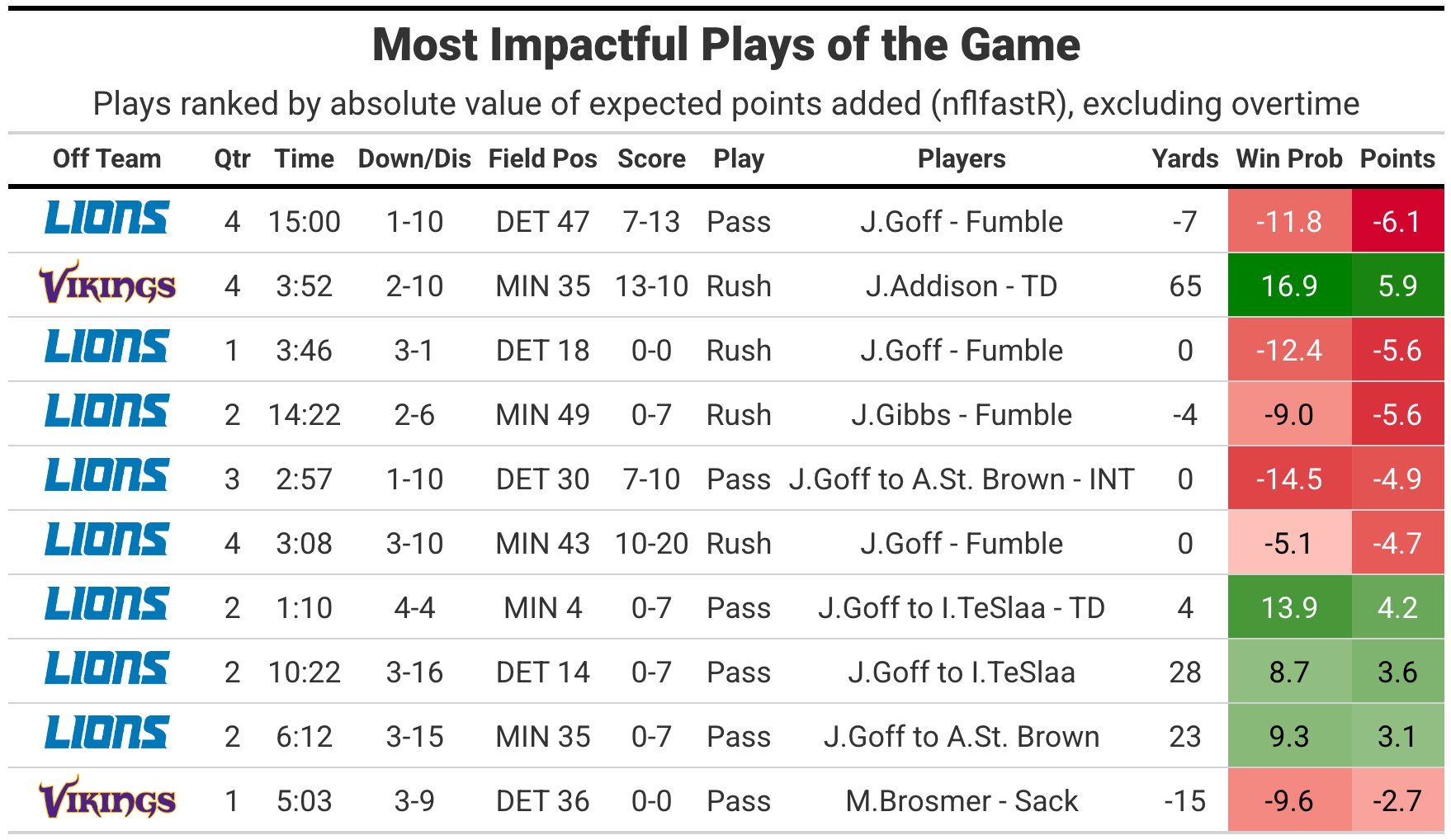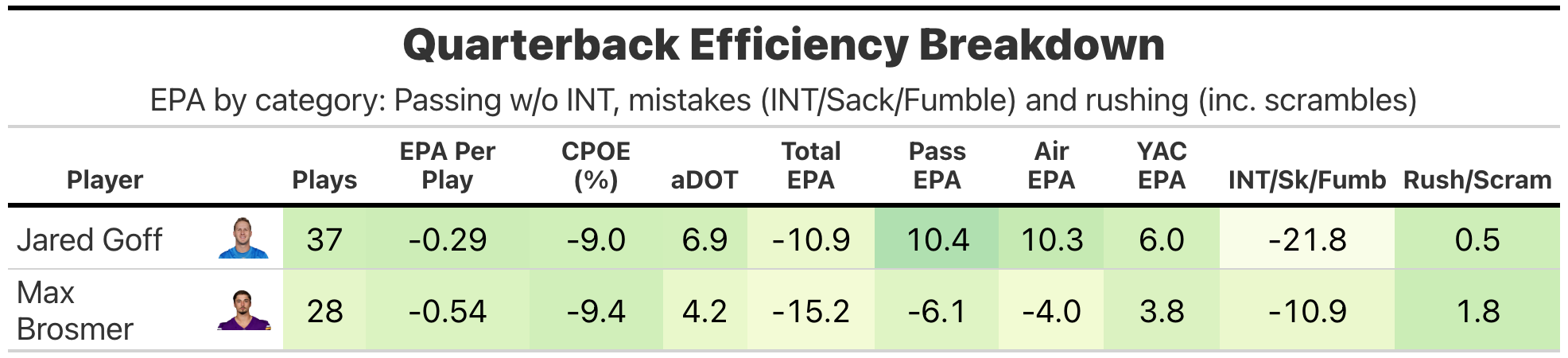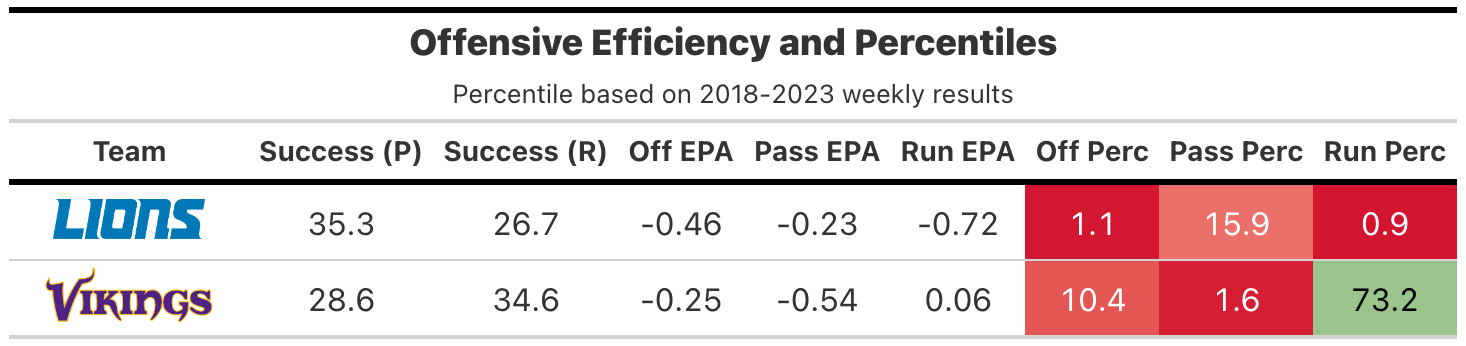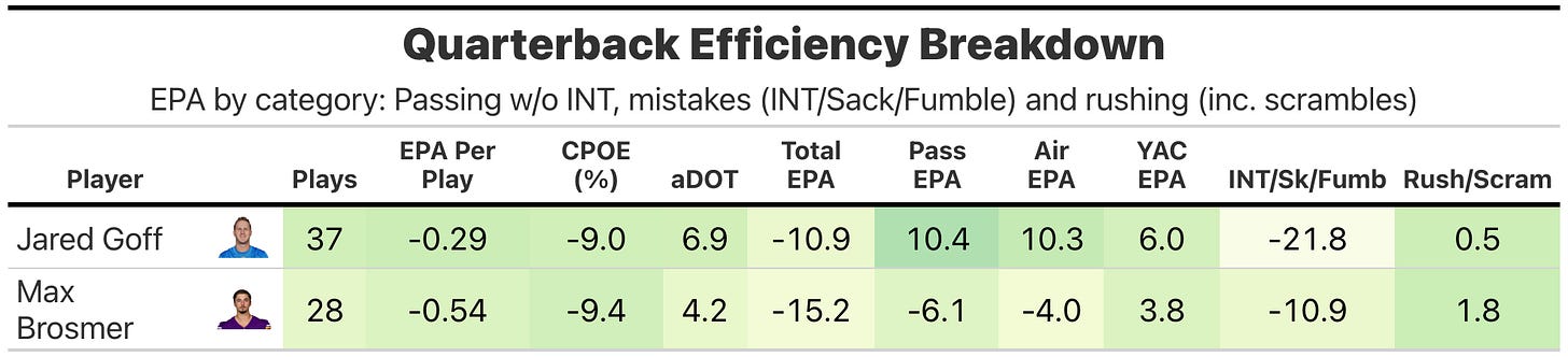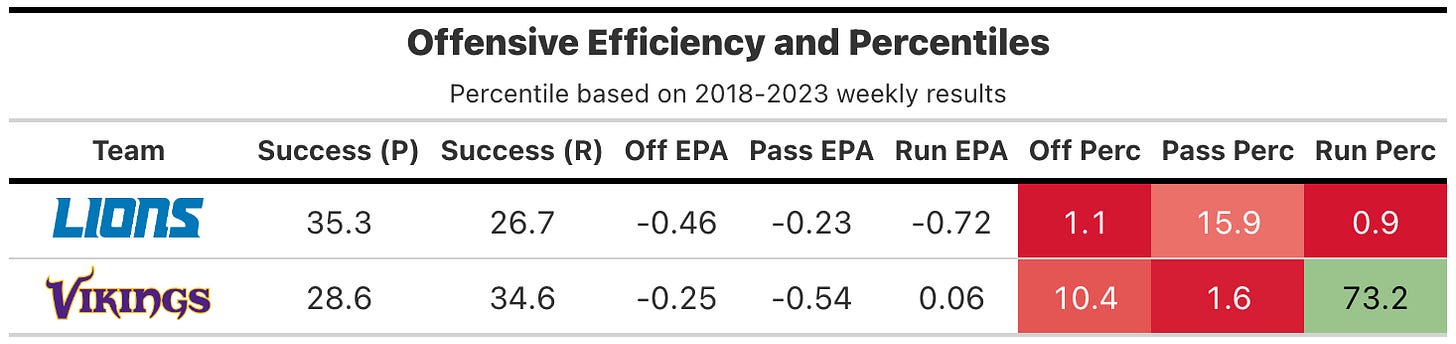 I mentioned a week ago that the Minnesota Vikings are relishing the role of spoiler, this week ending any chance the Detroit Lions make the postseason. It was an ugly game offensively, with the Vikings unable to move the ball, but their defense making the difference forcing six turnovers (+28.6 EPA) and sacking Jared Goff five times.