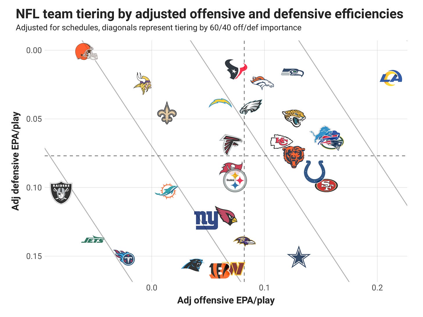 In this post, I’m going to walk through how my team-strength model views every team offensively and defensively for their 2025 performance going into Week 17, plus comparisons of my numbers to those derived by looking out over the next two weeks on the betting markets.