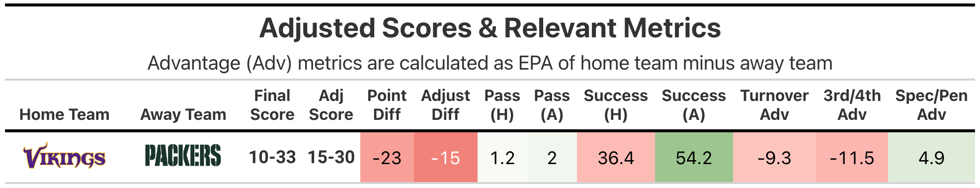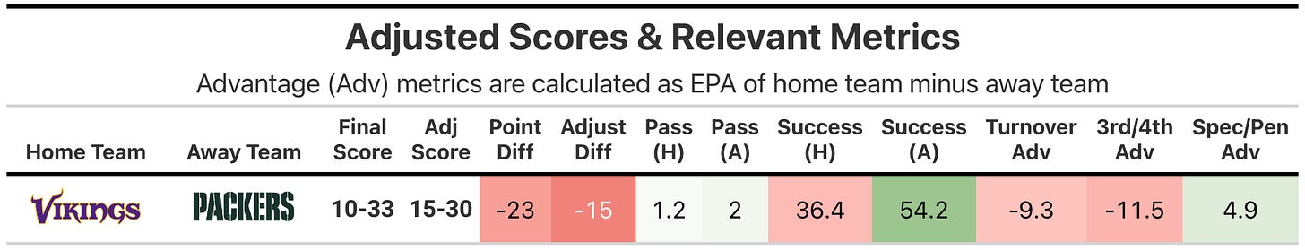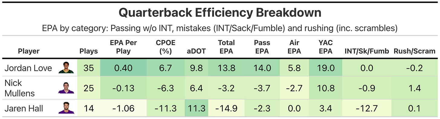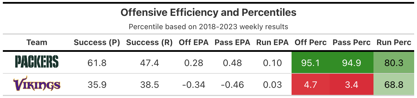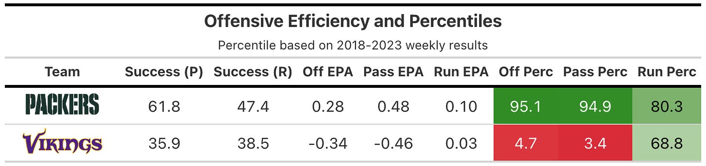 The Packers offense had nearly a +18% success rate versus the Vikings, and the EPA efficiencies were more extreme, with the Packers in the 95th percentile and the Vikings below the 5th.