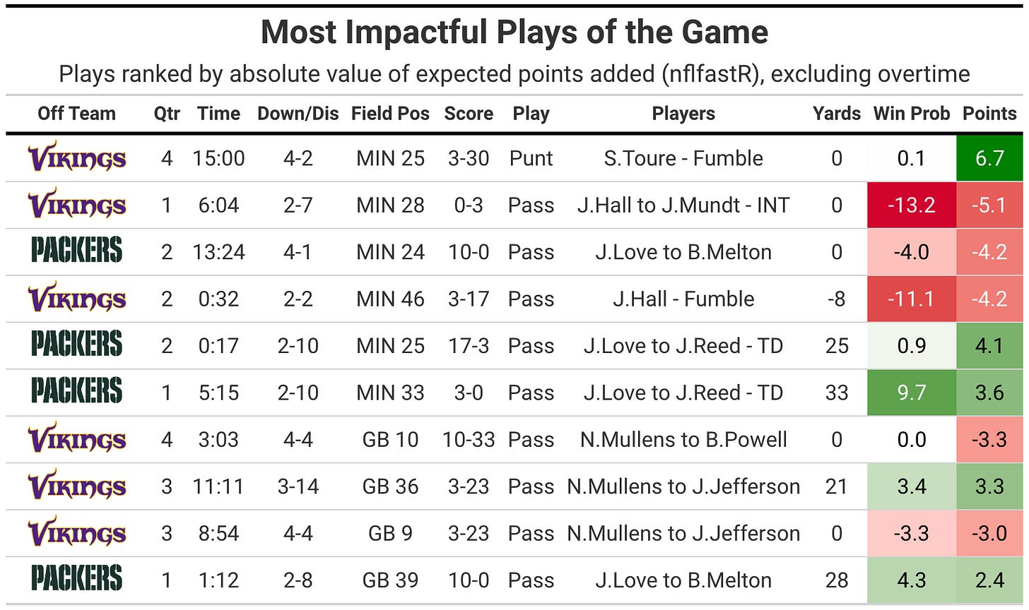 Weirdly the most impactful play by EPA was a punt fumble recovery by the Vikings, which netted 6.7 expected points, but only moved their win probability up by 0.1%, even though the whole fourth quarter remained. The Packers had an estimated win probability of 92% at halftime up 23-3, which rose to nearly 100% before the end of the third quarter up 30-3.