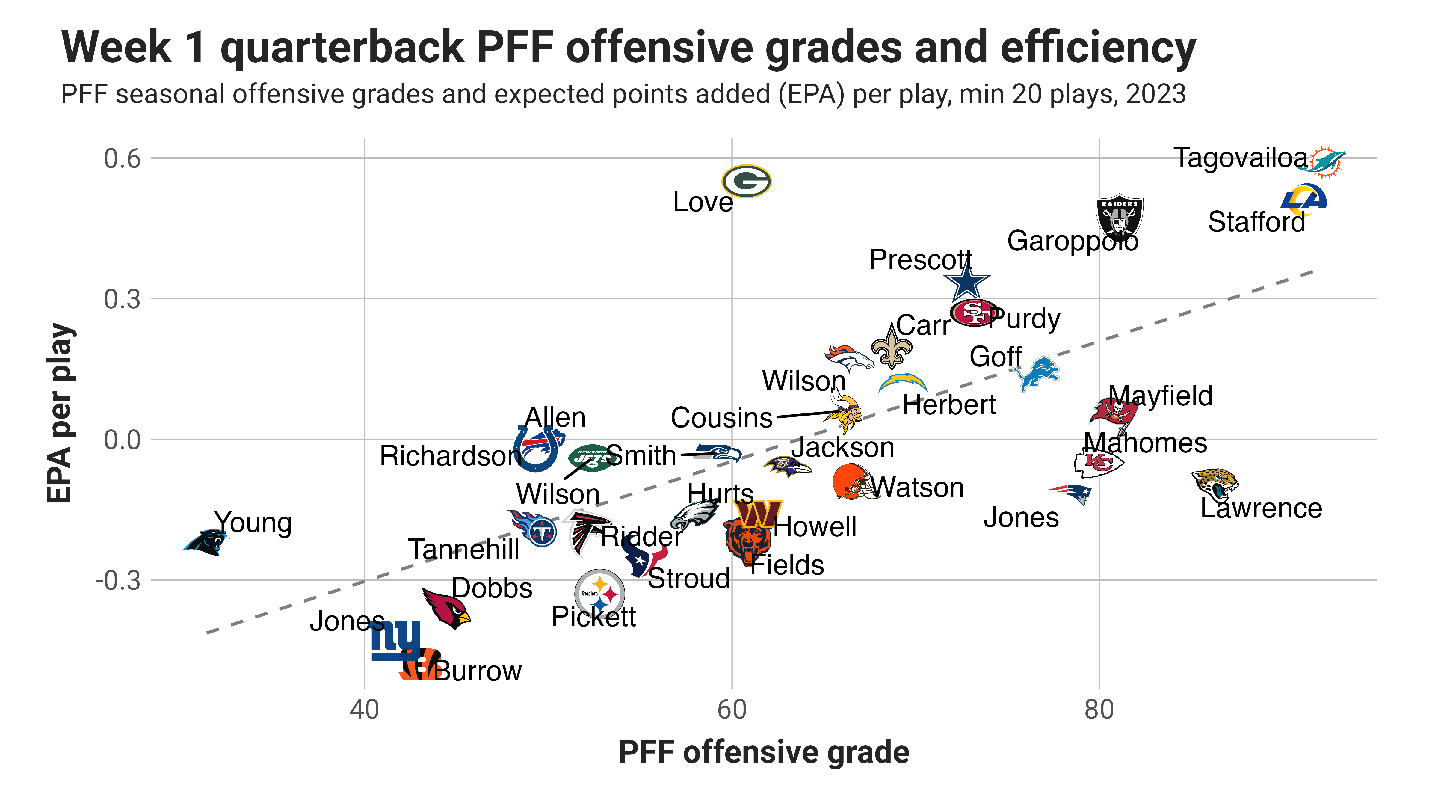 One thing to think about, especially early in the season, is how much luck (or unlucky) plays can affect EPA per play. A decent way to add some signal is to consider PFF grading - accounts for turnover-worthy plays, etc - in addition to EPA. You’ll see the in plot below that Jordan Love was, by far, the highest difference between his efficiency in EPA and what you would have expected by his pedestrian PFF grade.