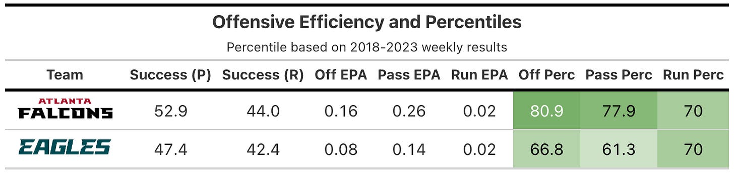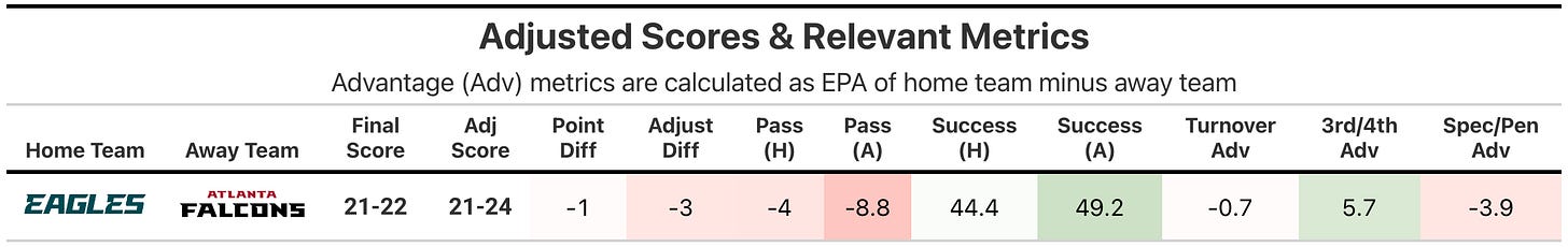 The adjusted scores agree with the actual for the most part, as the Falcons were the more successful offense on a play-by-play basis, but were hurt somewhat by relative underperformance on late downs (5.7 EPA advantage to the Eagles, Falcons only converted 2-of-9 third downs and 1-of-2 on fourth).