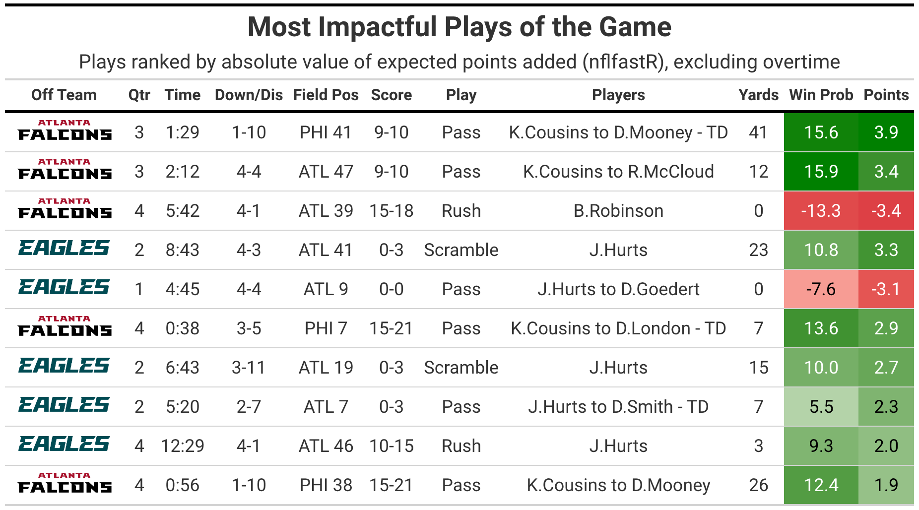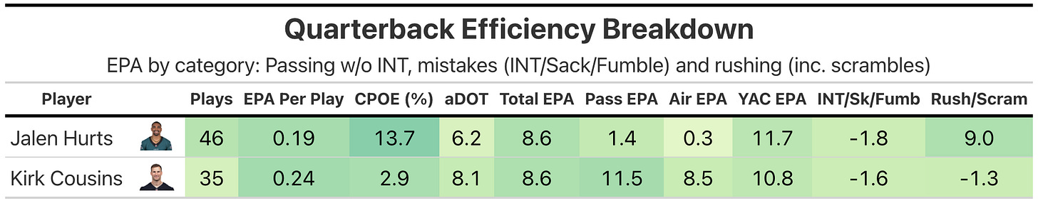 Hurts and Cousins finished with similar numbers, though the Eagles offense was more reliant on the former. Hurts was involved in 46 plays (38 dropbacks and eight designed runs), generating almost all of his EPA on the ground (+3.3 on those runs, +5.7 on four scrambles). Hurts was also extremely accurate, but his overall passing efficiency was lowered significantly by a failed 4th & 4 pass in the first quarter (-3.1 EPA).