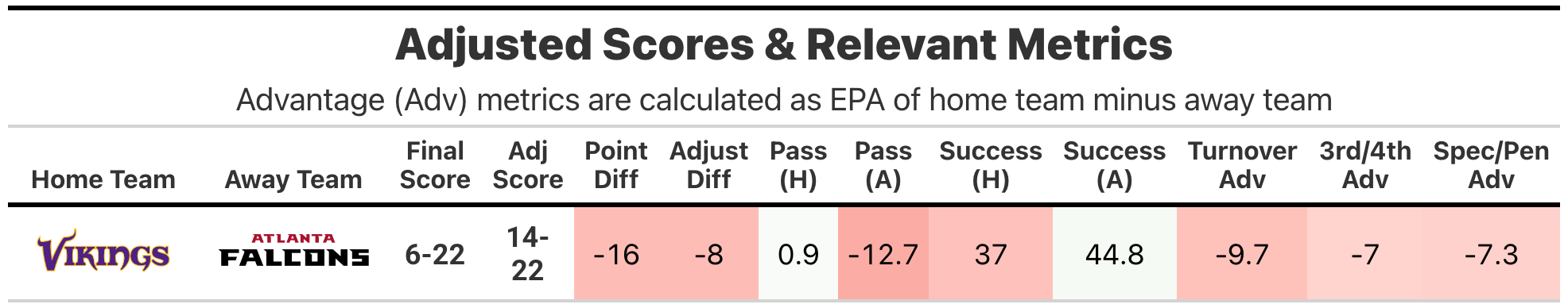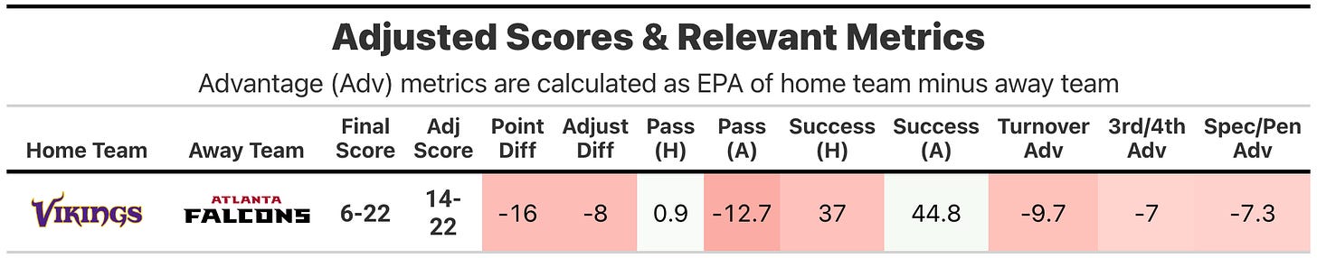 The story of the game was an Atlanta Falcons defense that held the Minnesota Vikings offense to awful EPA efficiency: the 1st percentile at -0.46 per play. The Vikings offensive success rate wasn’t as bad (37%), but enormous turnover losses (three for a total of 15.6 expected points lost) crushed their dropback efficiency.