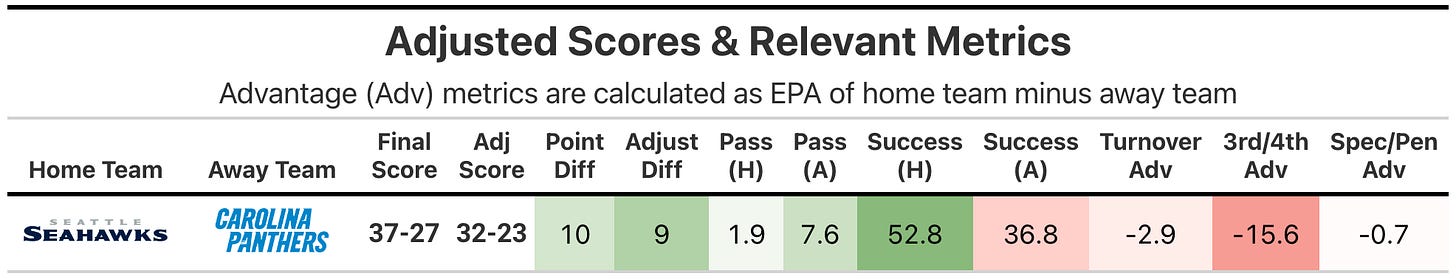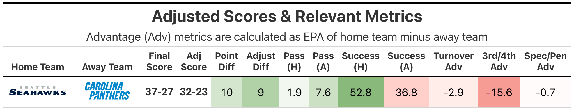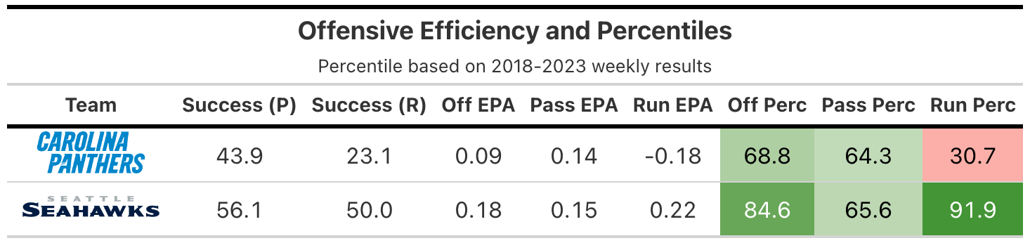The biggest differences in the game were the teams’ respective abilities to convert third downs, with the Seahawks going 10-for-20 and the Panthers 3-for-12. The Seahawks offense was also generally more successful, especially running the ball (rate of 50% to 23.1%). Miles Sanders had 24 yards on nine carries, while Kennth Walker and Zach Charbonnet combined for 153 yards on 27 carries.