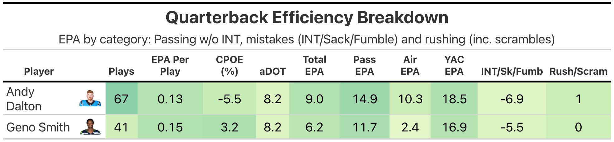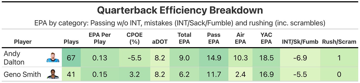 Andy Dalton almost matched Geno Smith’s efficiency, avoiding turnovers and adding decent value on huge volume. There doesn’t appear to be a reason to rush back rookie Bryce Young, though the results might just be about how bad the Seahawks pass defense has become. They made Adam Thielen look like Justin Jefferson (14 targets, 11 receptions, 143 yards and a touchdown).